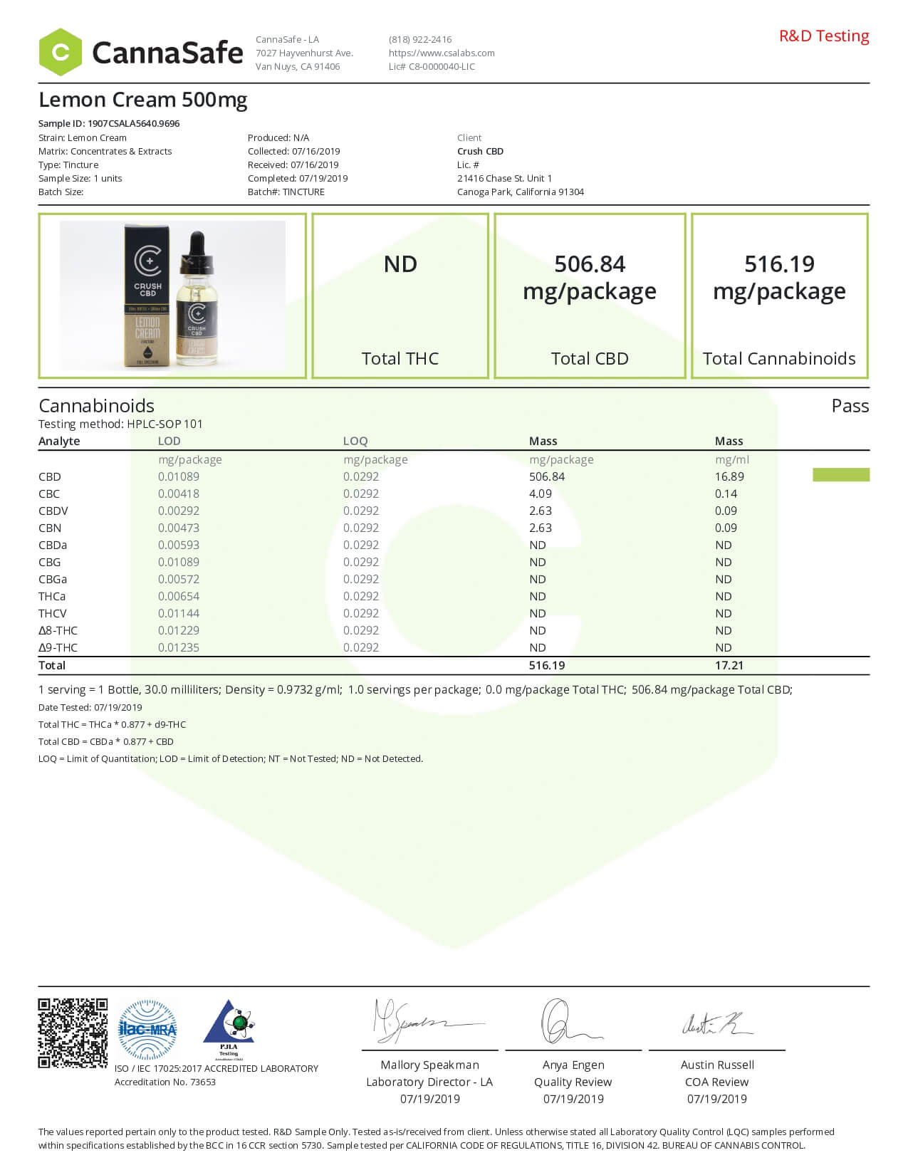 Crush CBD Tincture Lemon Cream 500mg Lab Report
