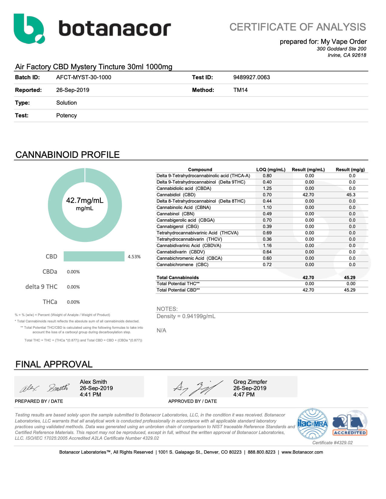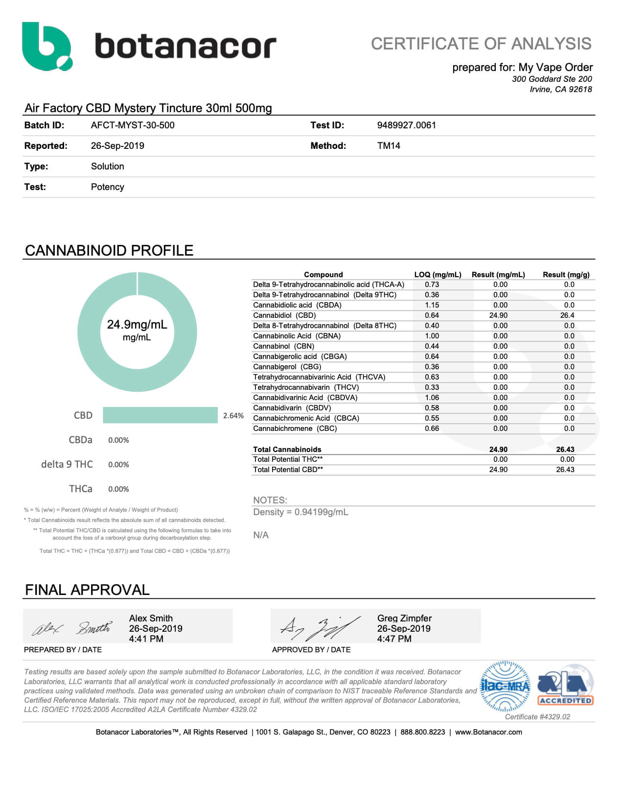 Air Factory CBD Mystery Tincture Lab Report results provided to ensure accurate information in regards to vaping and its distinct product.
