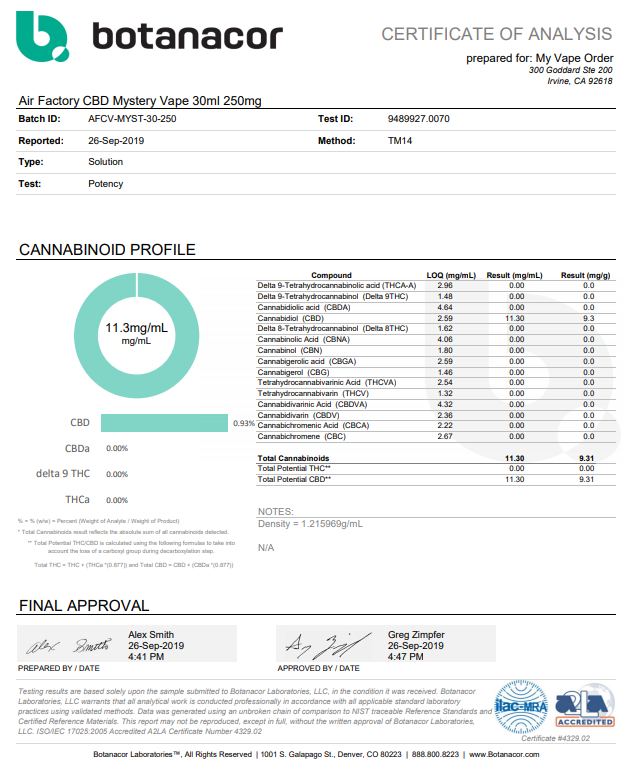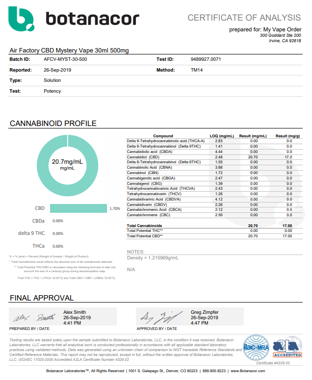 Air Factory CBD Mystery Vape Juice Lab Reports related information to products corresponding to vaping.
