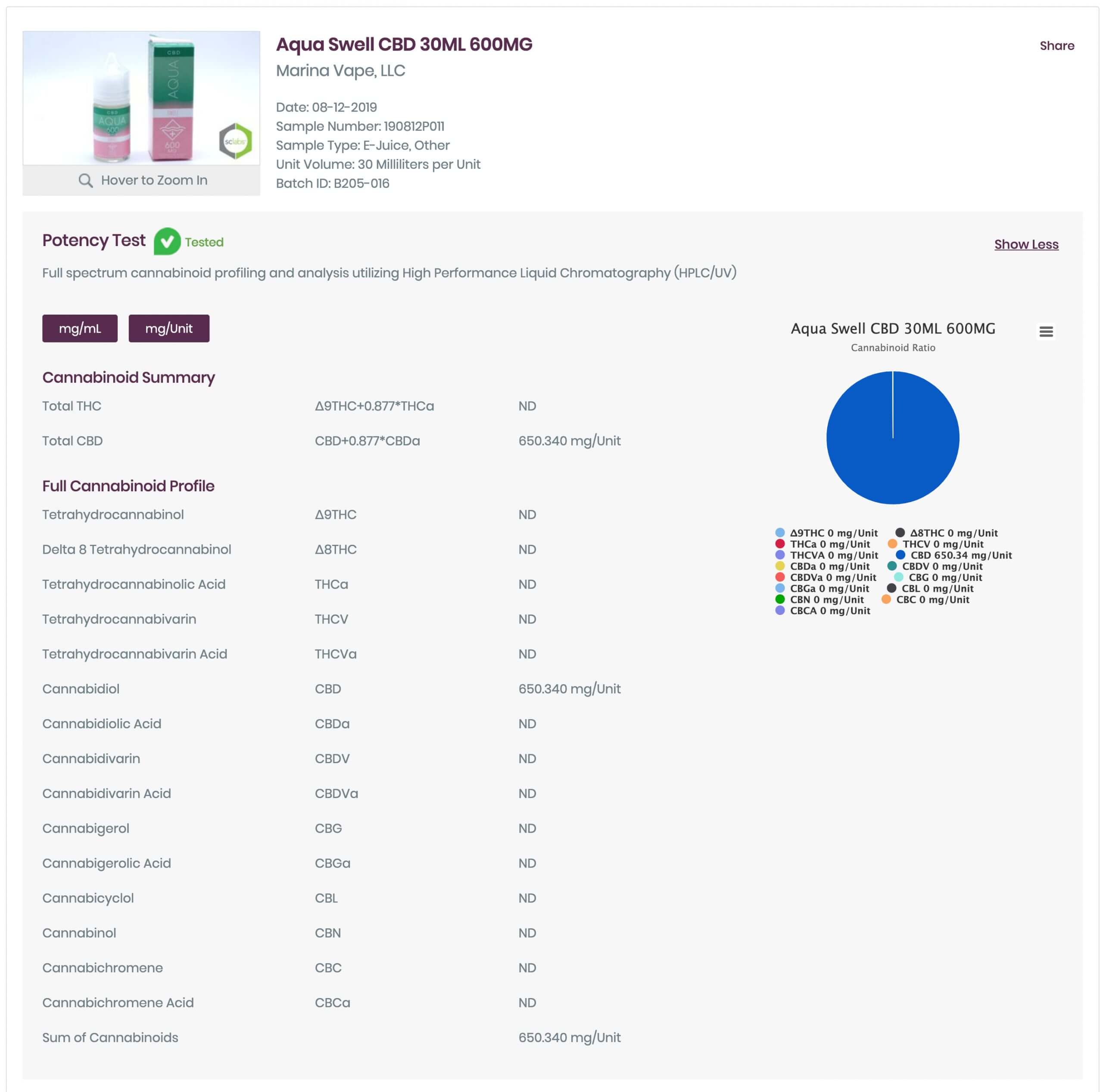 Lab results provided for AQUA CBD Swell Vape Juice to help you understand the