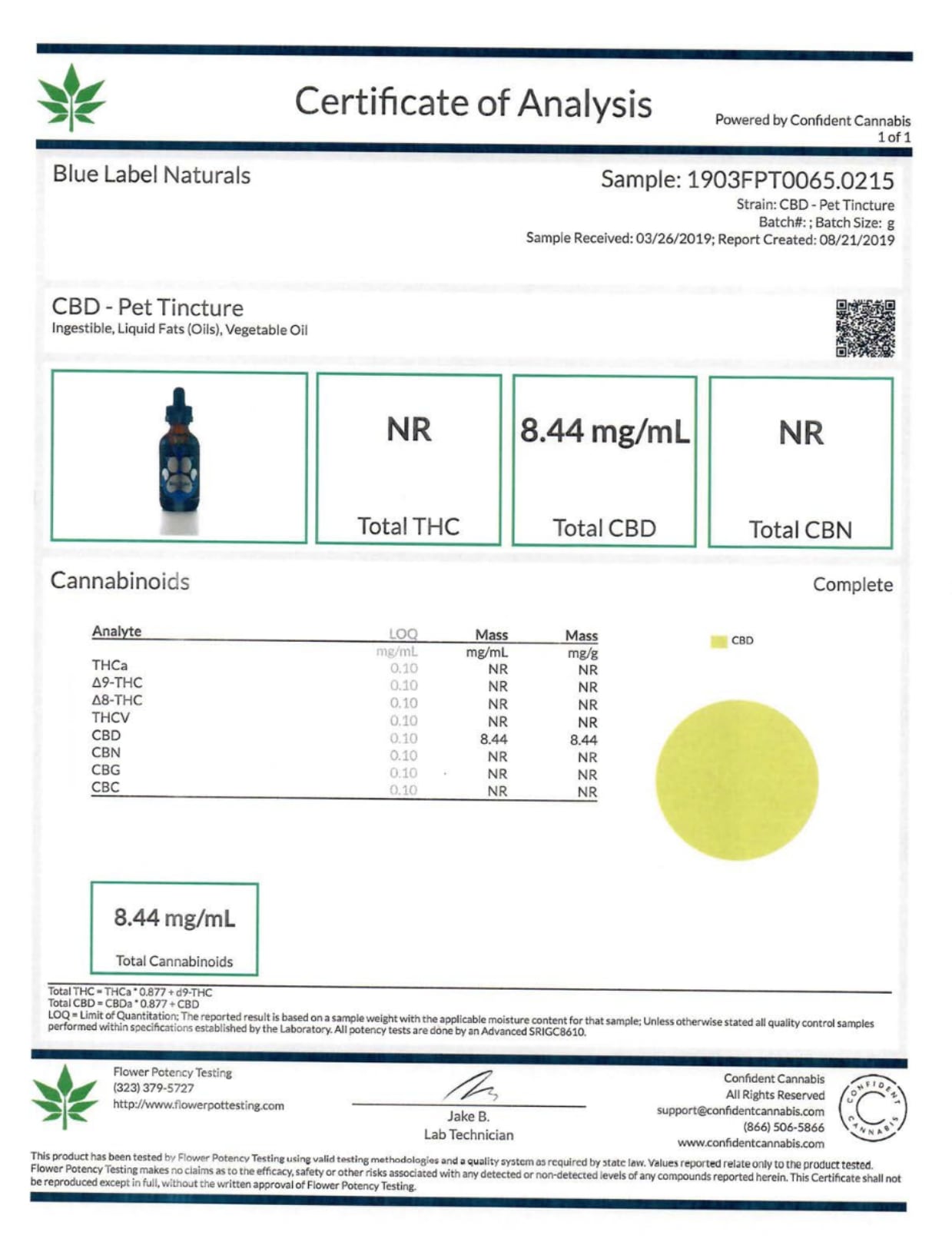 Blue Label CBD Pet Tincture Bacon Lab Report