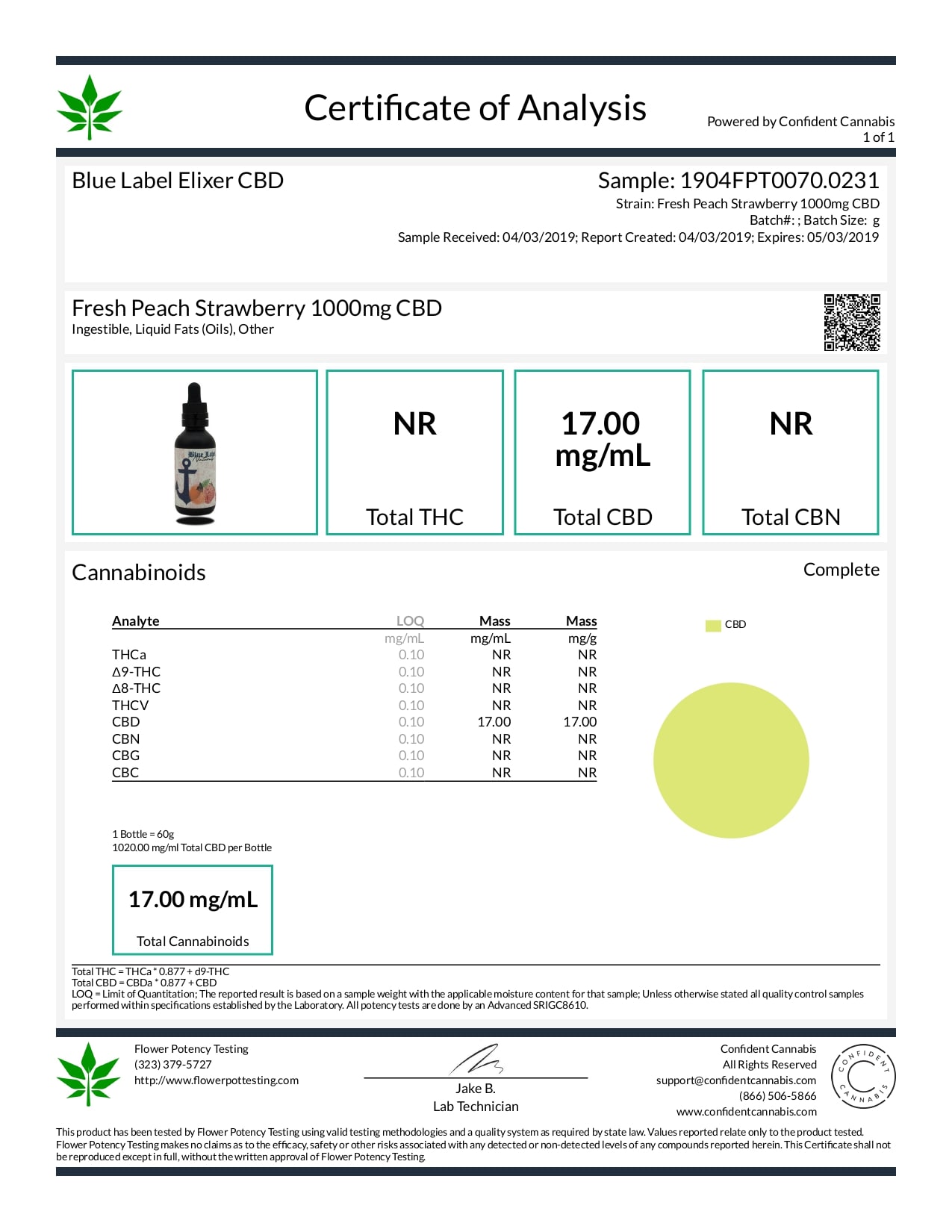 Blue Label CBD Tincture Peach and Strawberry 1000mg Lab Report