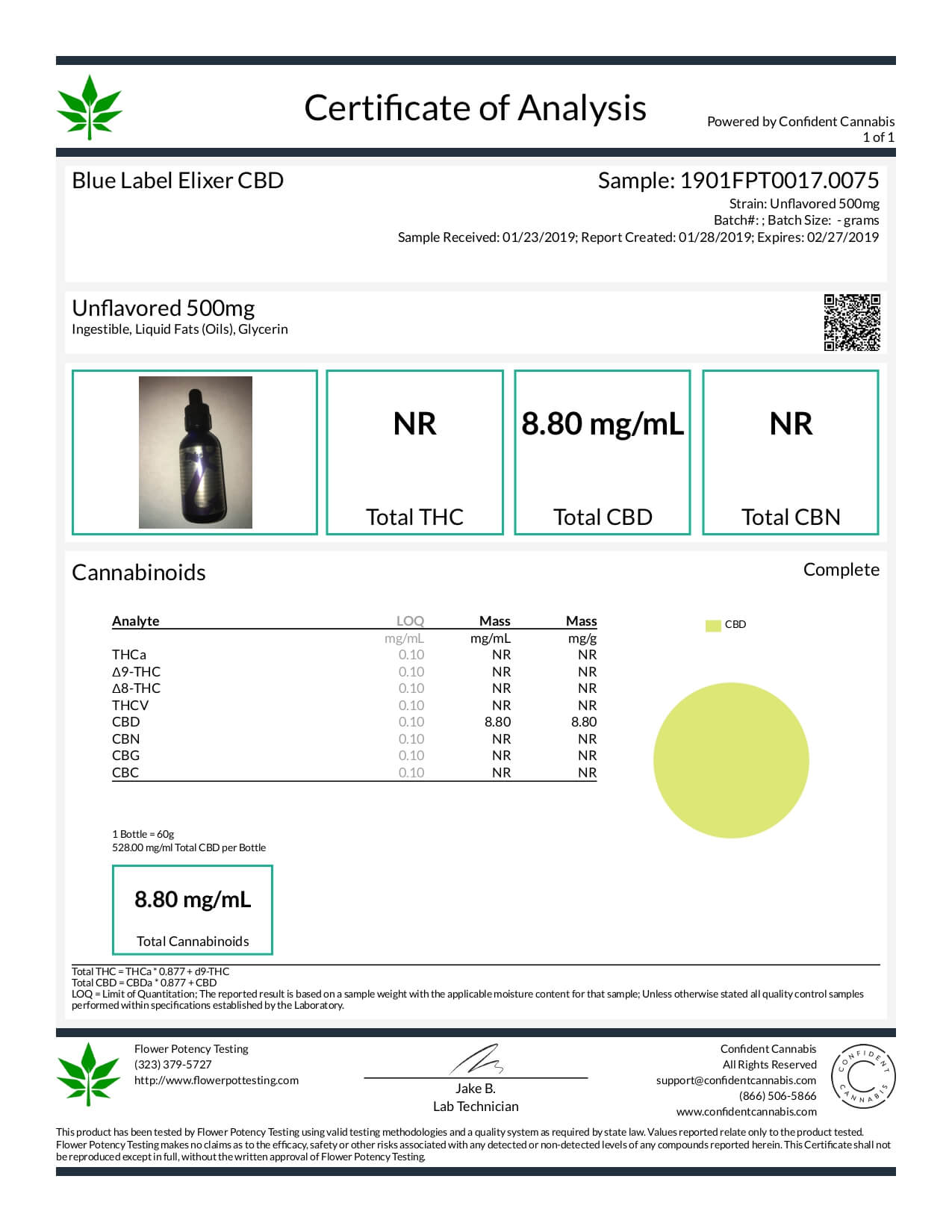 Blue Label CBD Vape Juice Unflavored Additive 500mg Lab Report