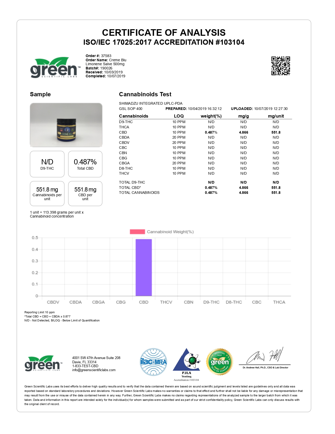 Blue Moon Hemp CBD Topical Limonene Salve Lab Report