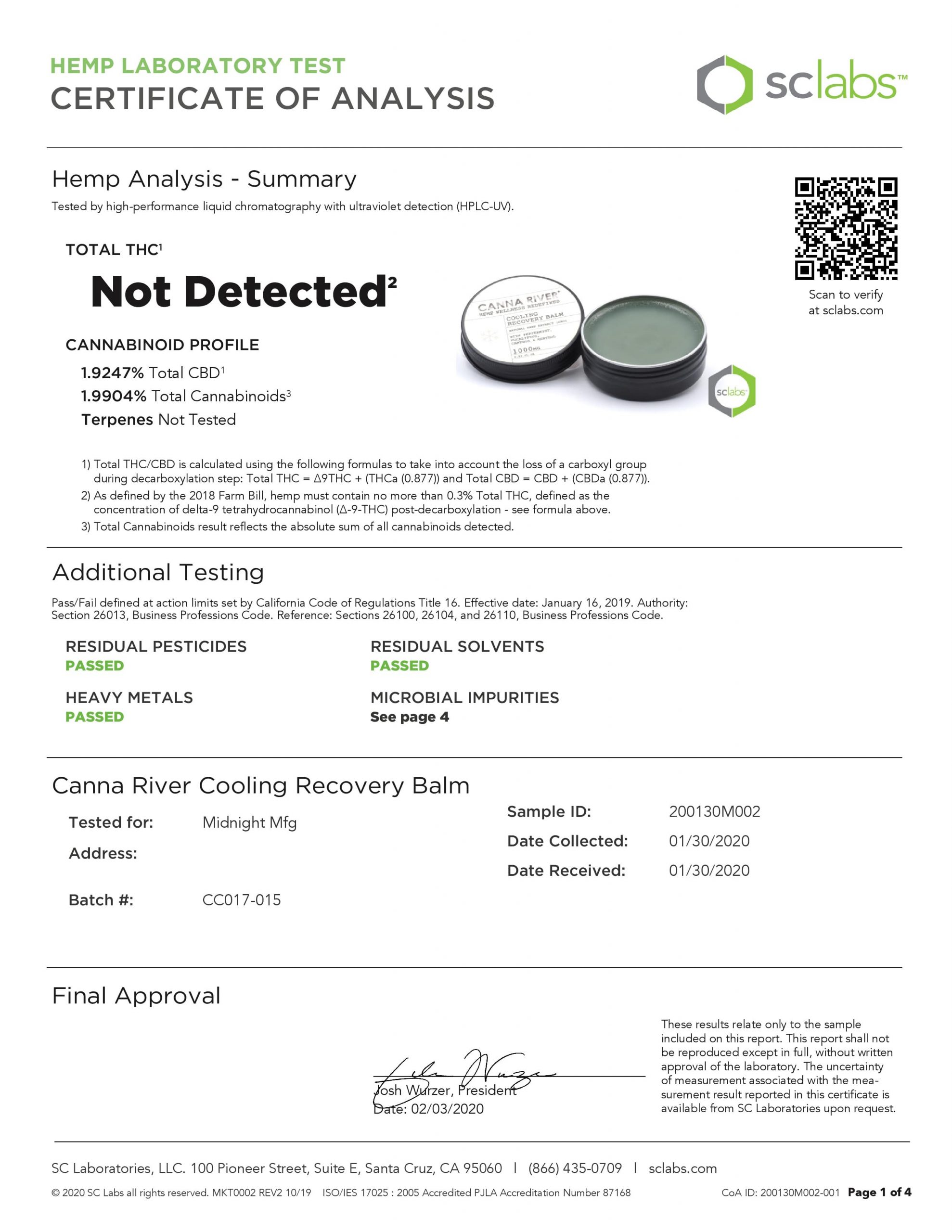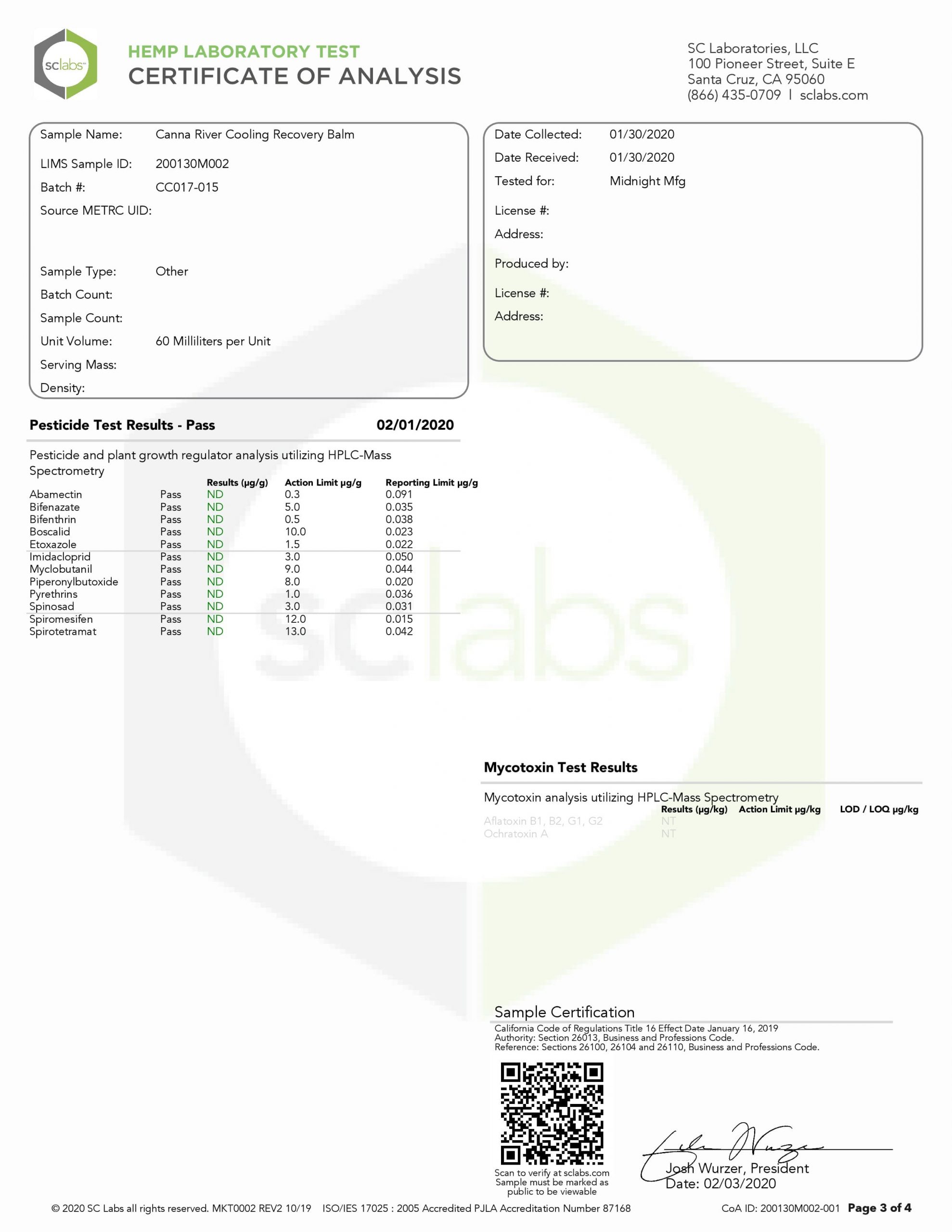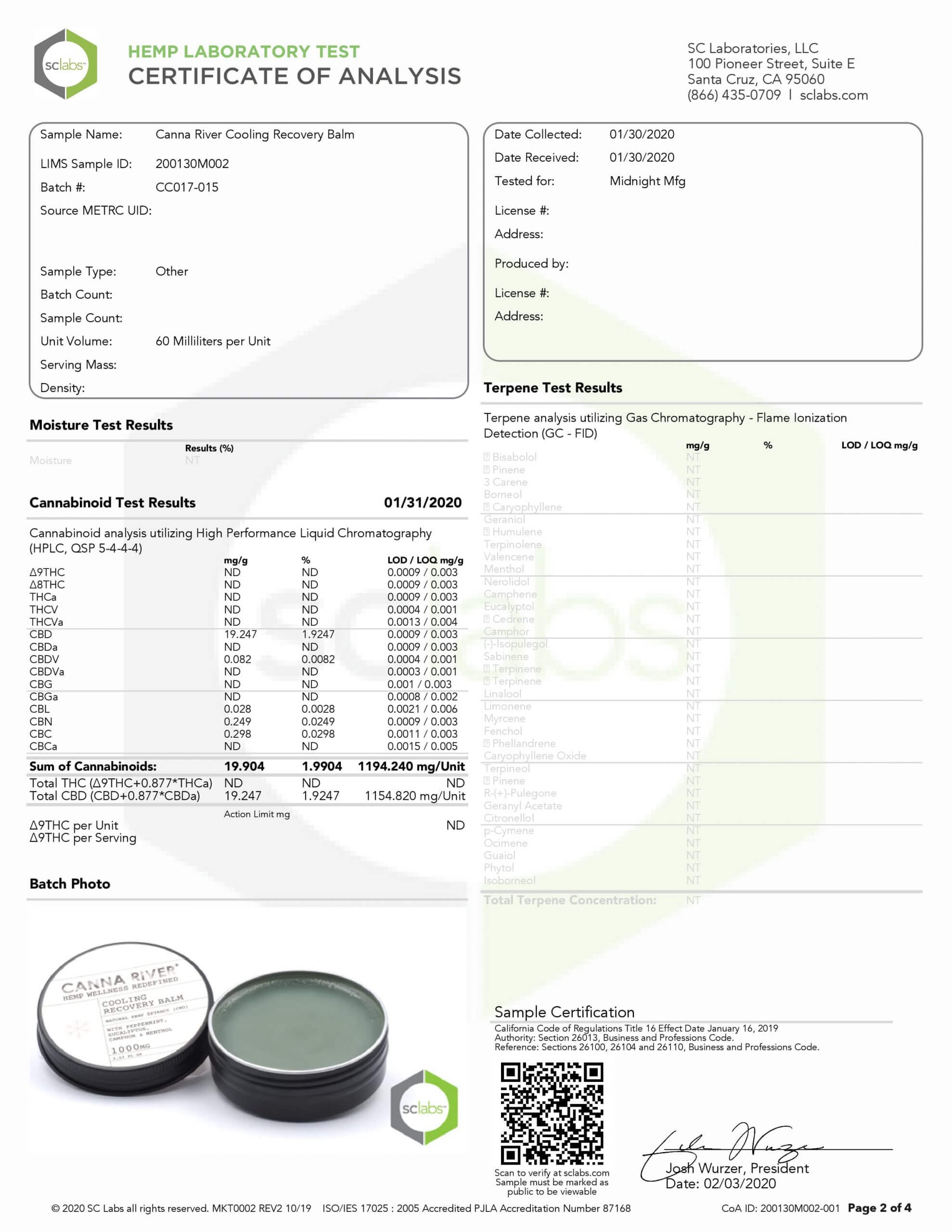 CANNA RIVER CBD Cooling Recovery Balm Broad Spectrum Lab Reports test results with reference to CBD products.