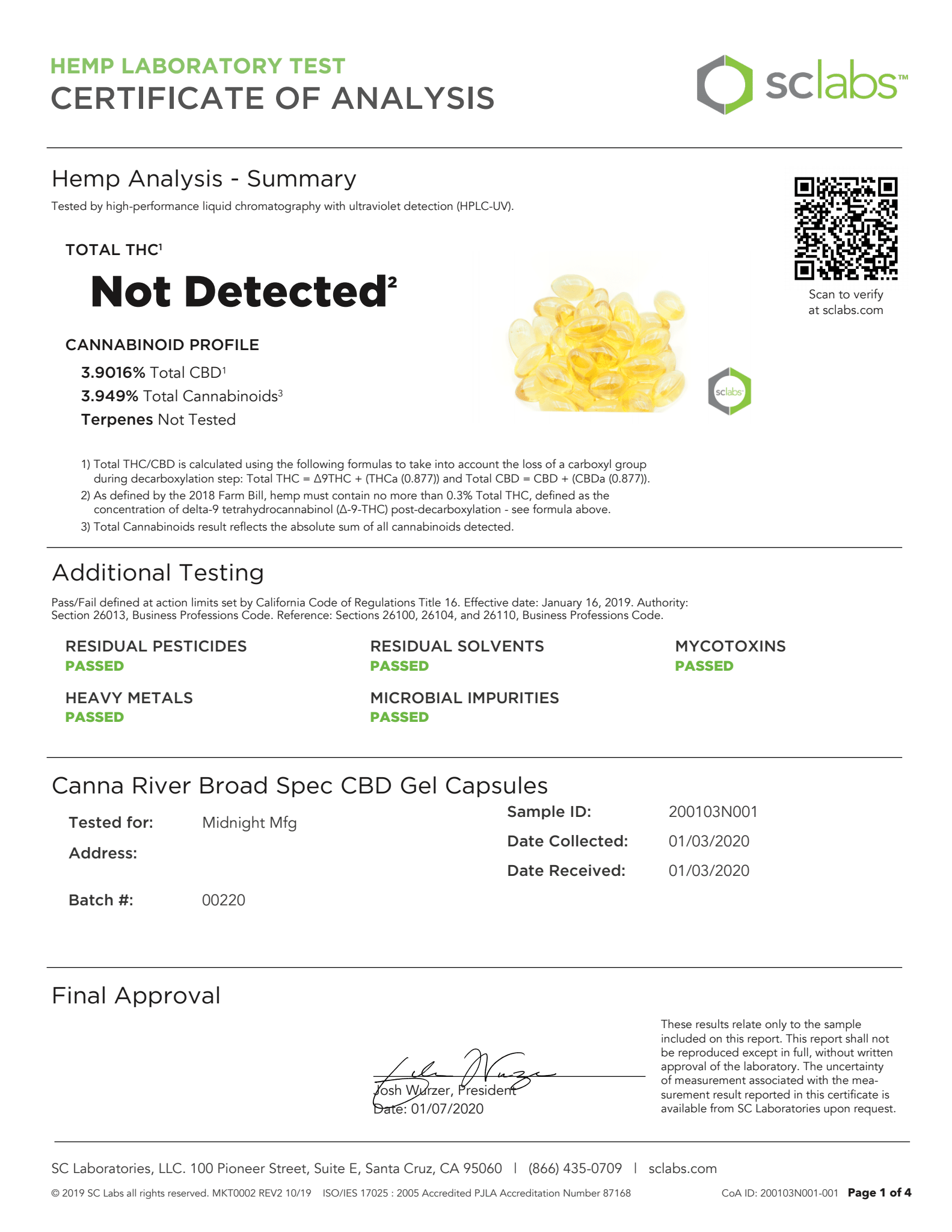 CANNA RIVER CBD Gel Capsules Broad Spectrum Lab Report