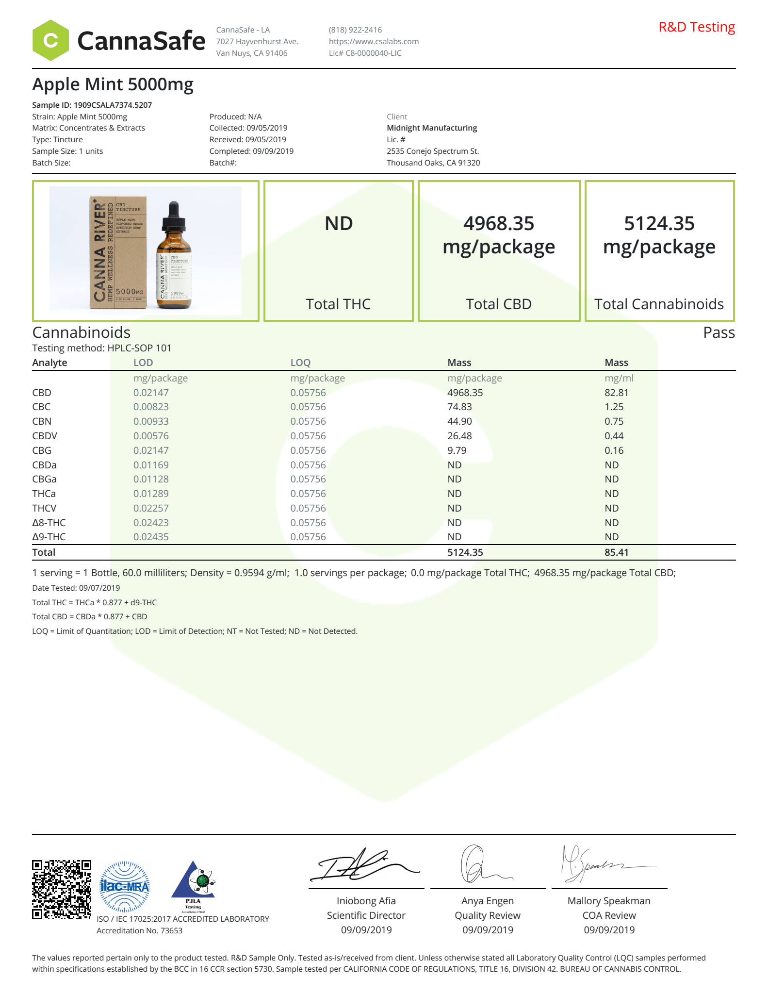 CANNA RIVER CBD Tincture Broad Spectrum Apple Mint Lab Reports test results with reference to CBD products.