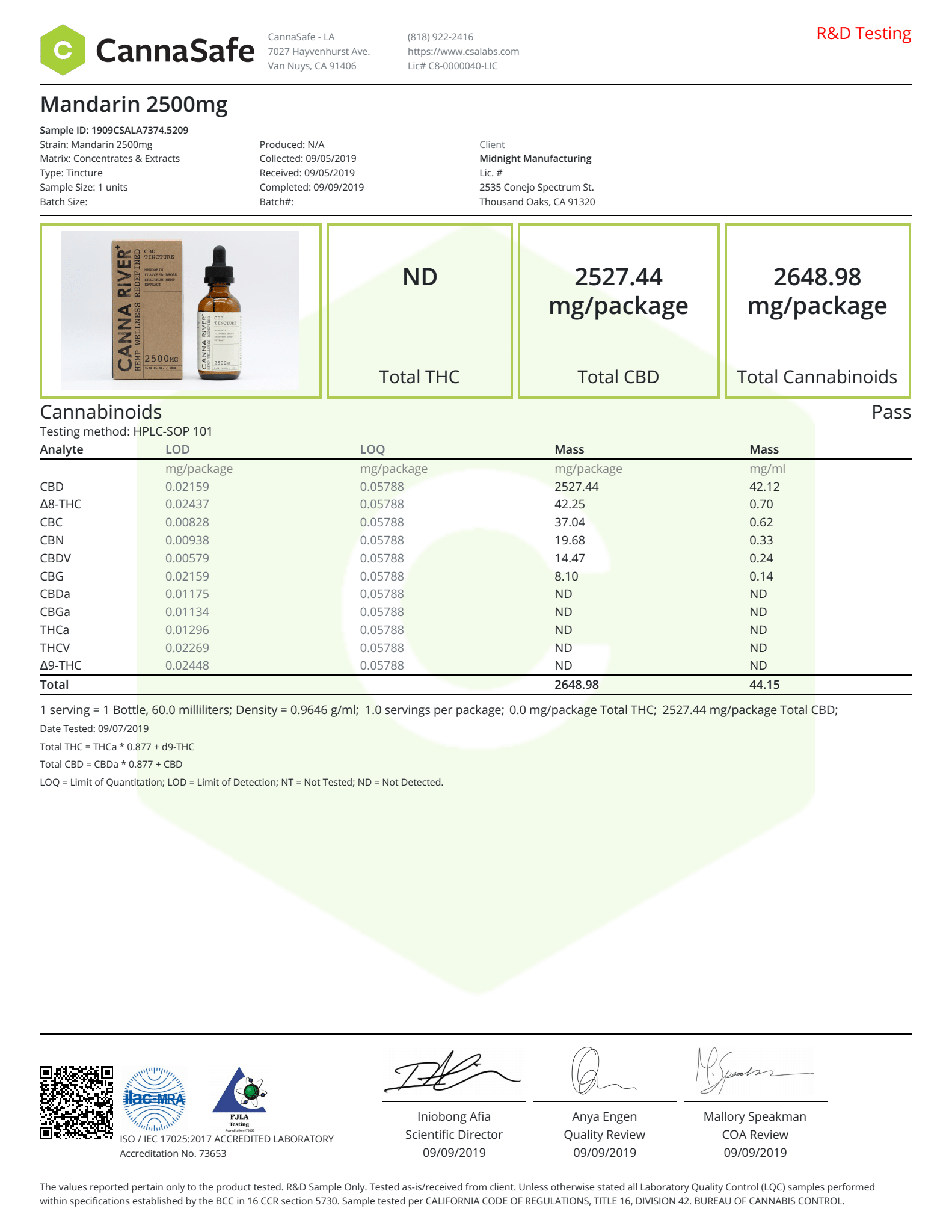 CANNA RIVER CBD Tincture Broad Spectrum Mandarin Lab Reports test results with reference to CBD products.