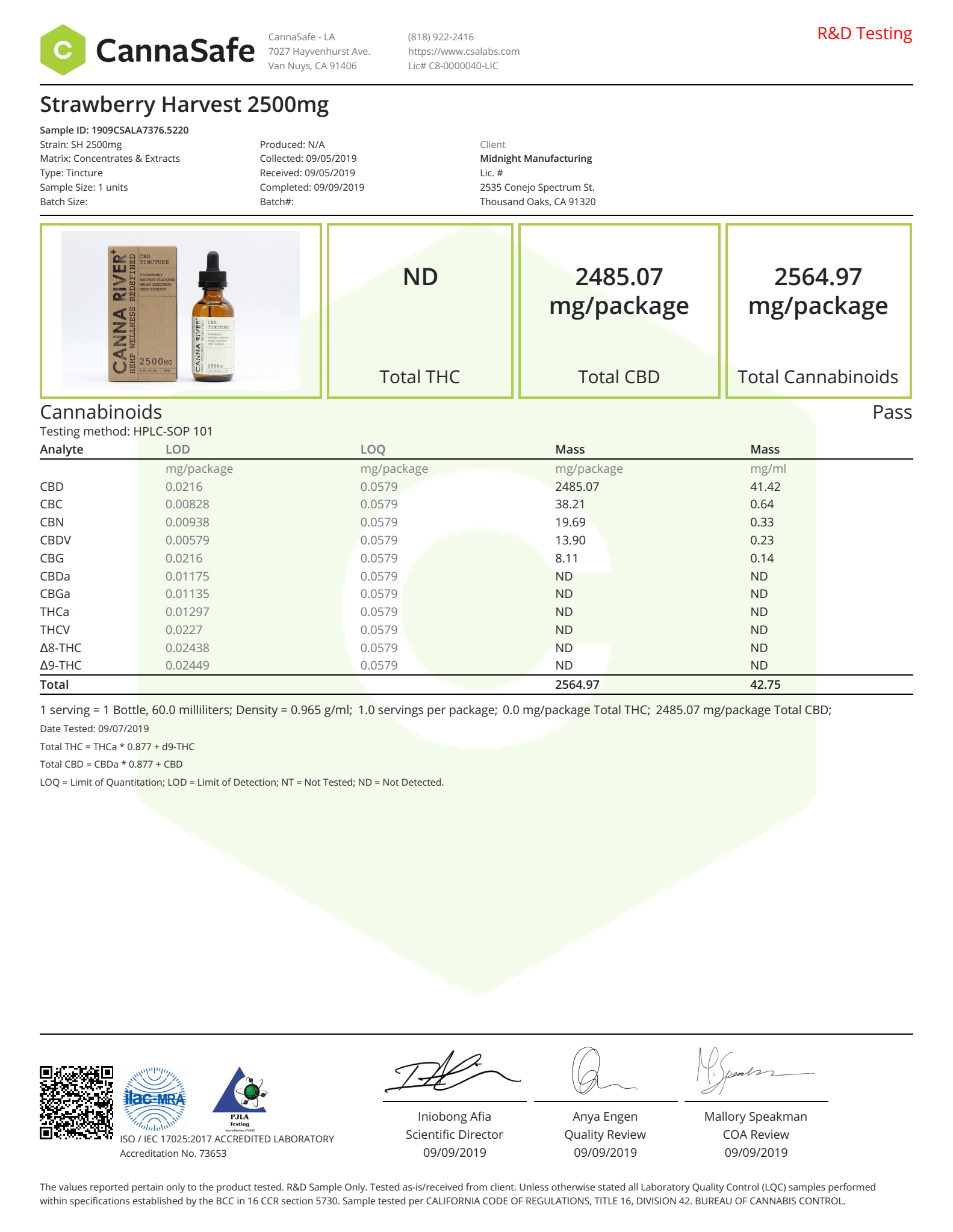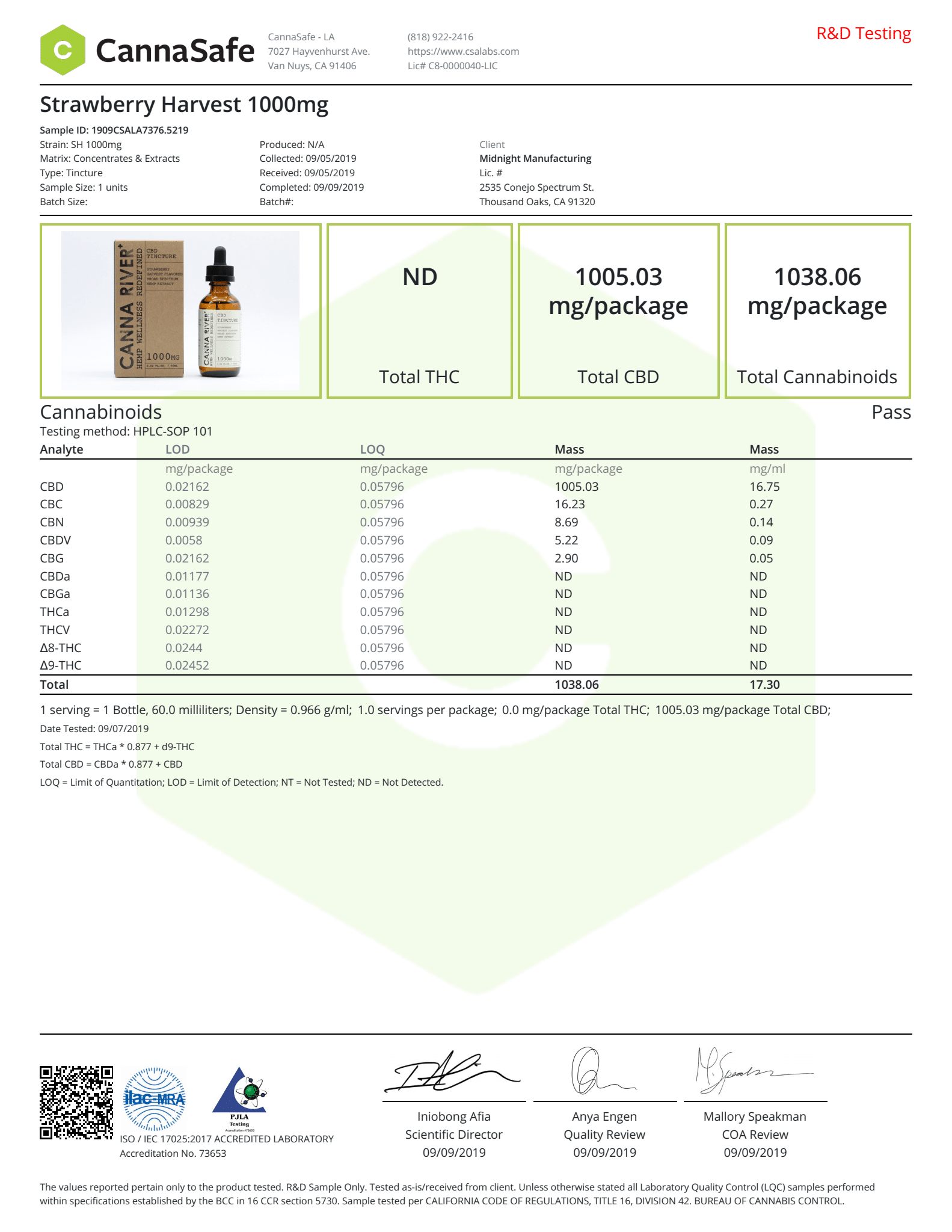 CANNA RIVER CBD Tincture Broad Spectrum Strawberry Harvest Lab Reports test results with reference to CBD products.