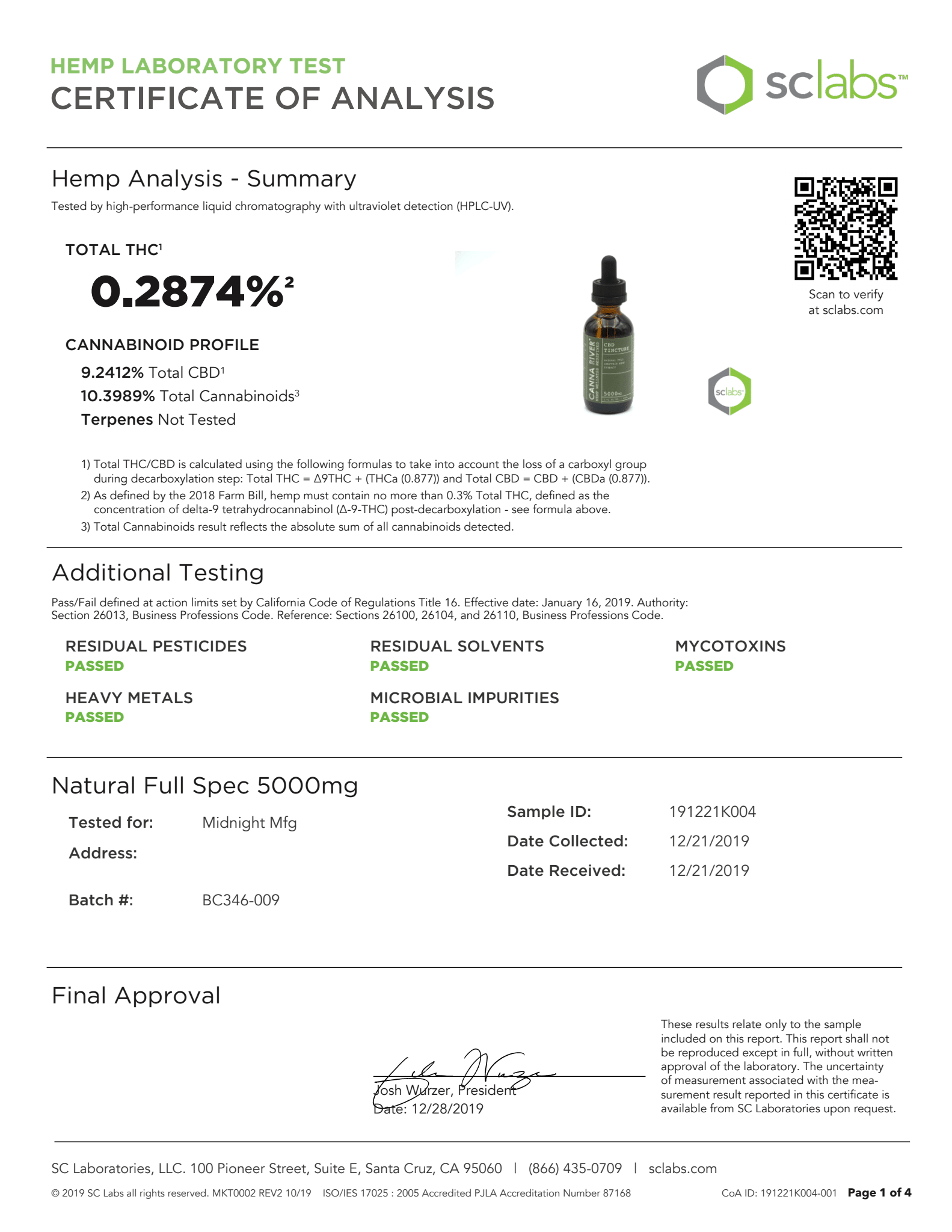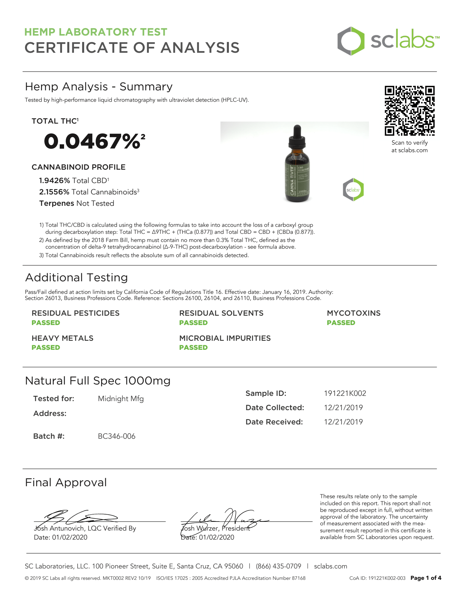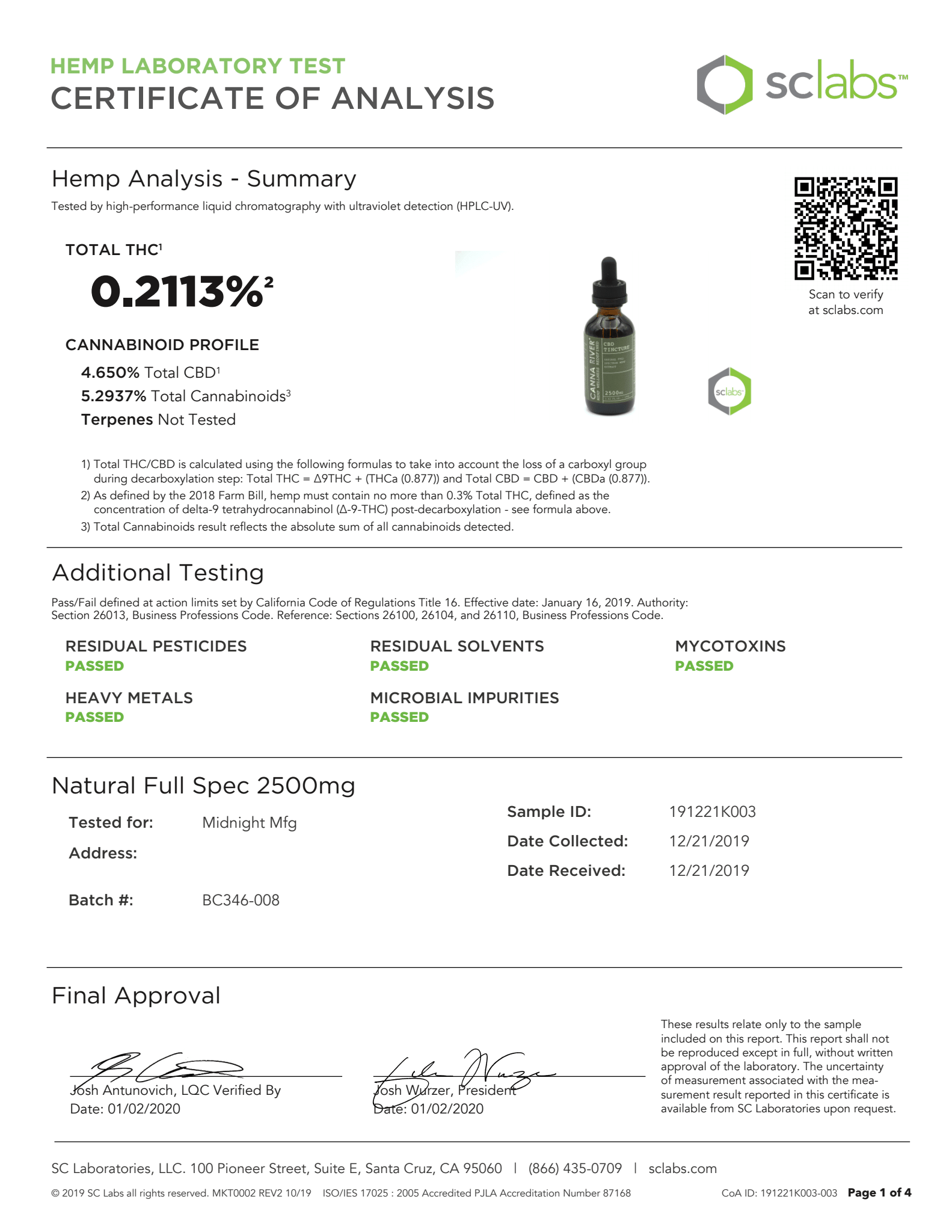 CANNA RIVER CBD Tincture Full Spectrum Natural Lab Reports test results with reference to CBD products.