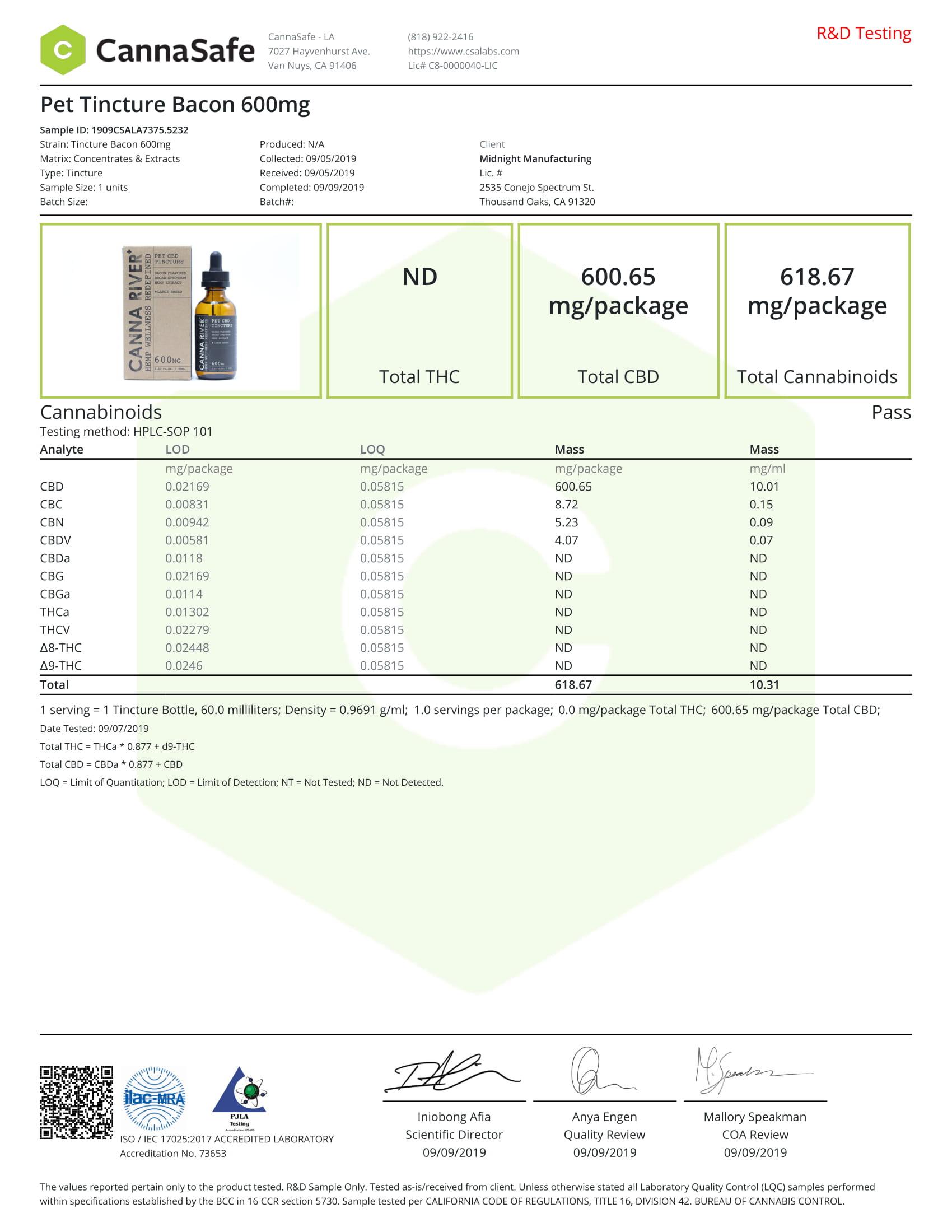 CANNA RIVER Pet CBD Tincture Broad Spectrum Large 60ml Lab Reports test results with reference to CBD products.