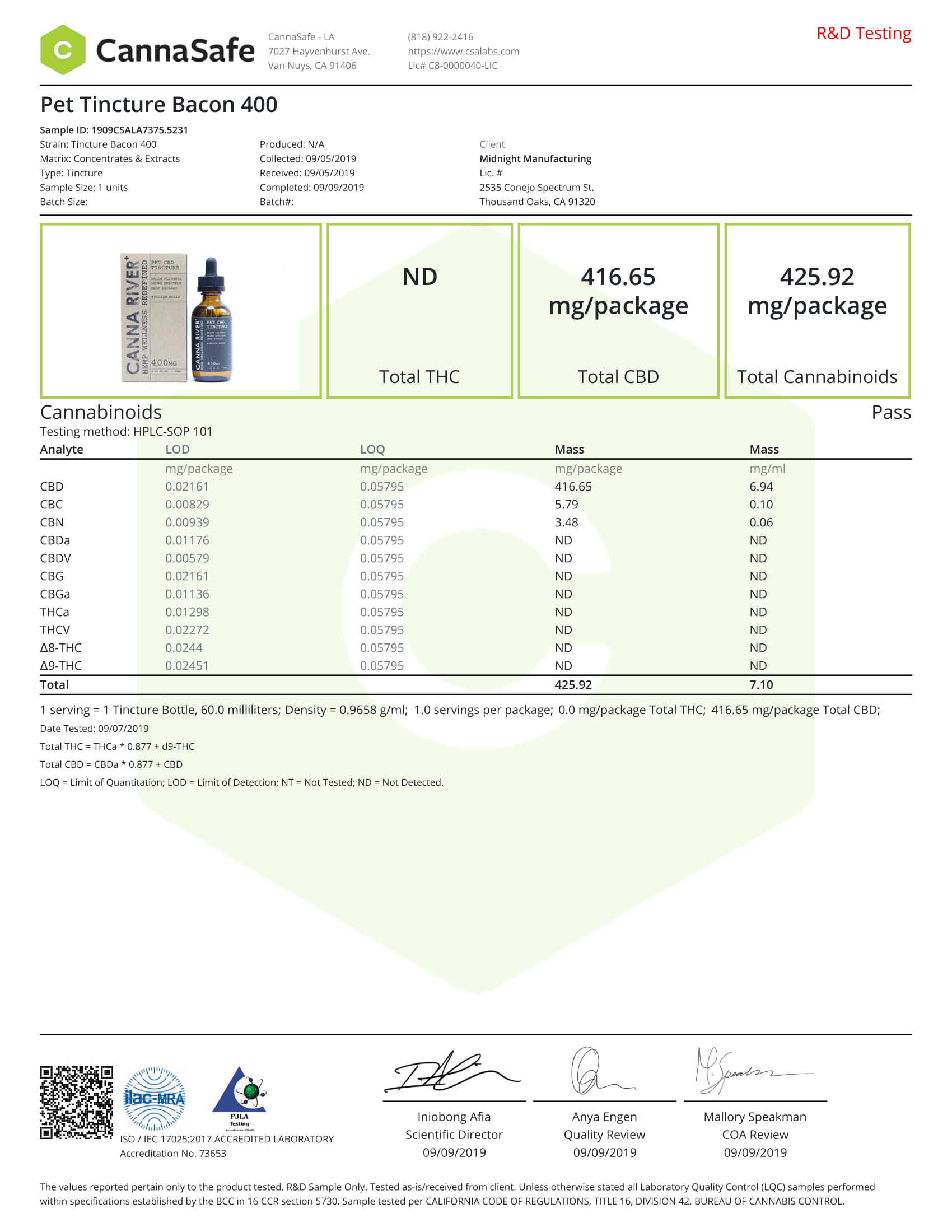 CANNA RIVER Pet CBD Tincture Broad Spectrum Medium 60ml Lab Reports test results with reference to CBD products.
