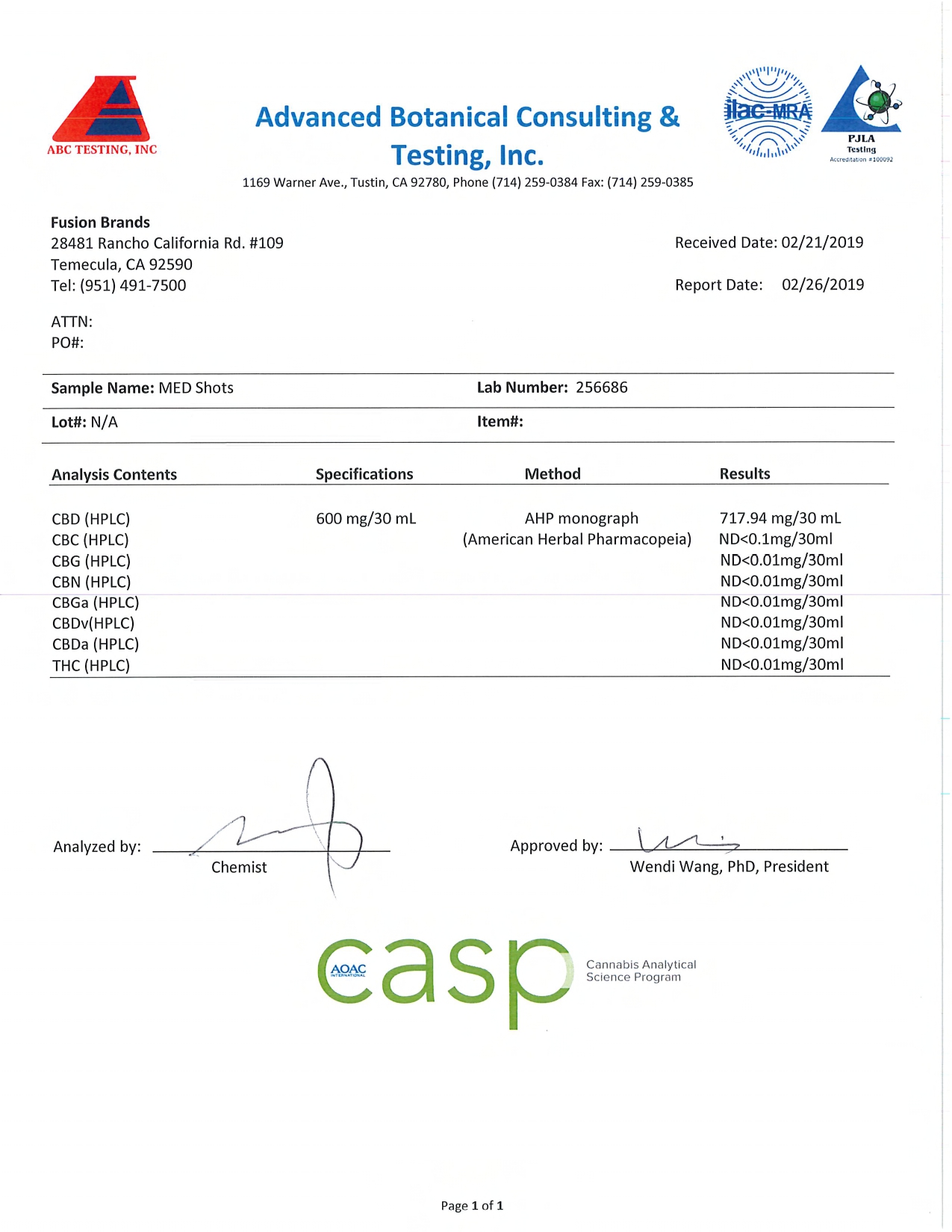 CBD Fusion Avocado CBD Med Shots 600mg Lab Report