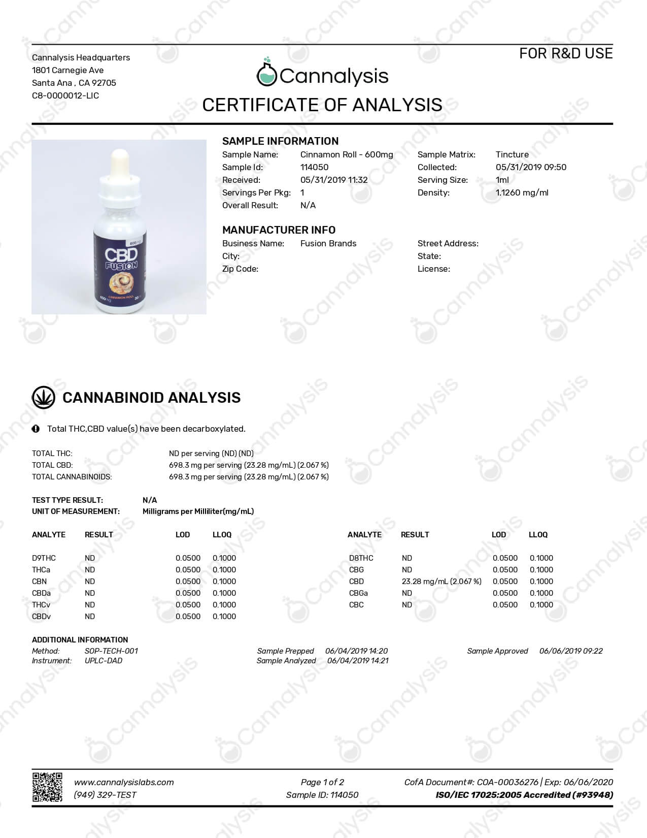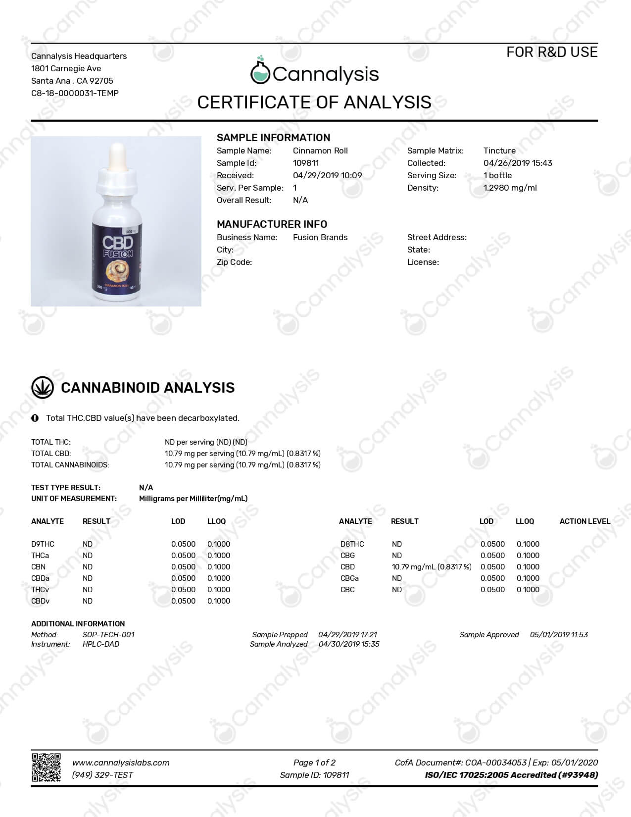 CBD Fusion CBD Vape Cinnamon Roll Lab Report