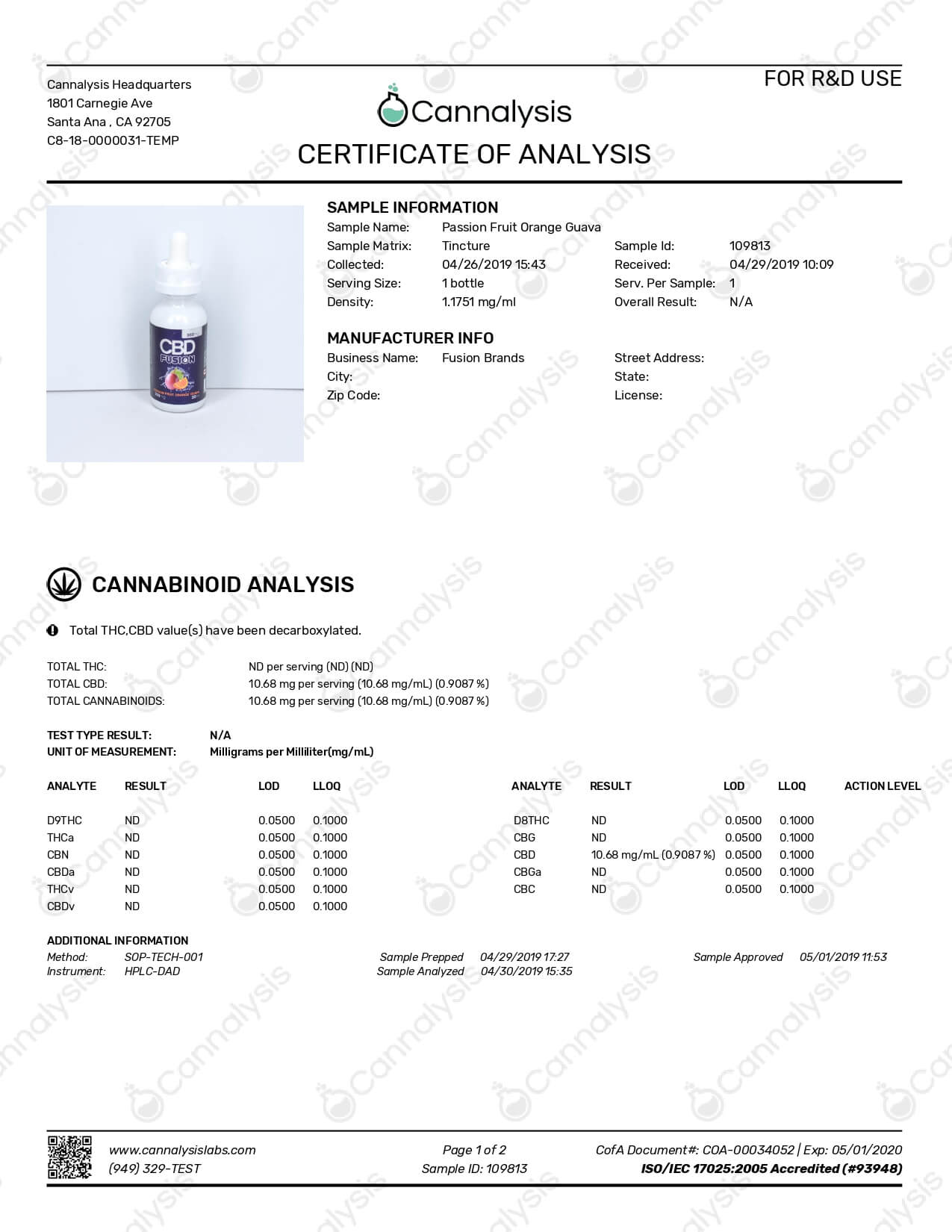 CBD Fusion CBD Vape Passionfruit Orange Guava Lab Report