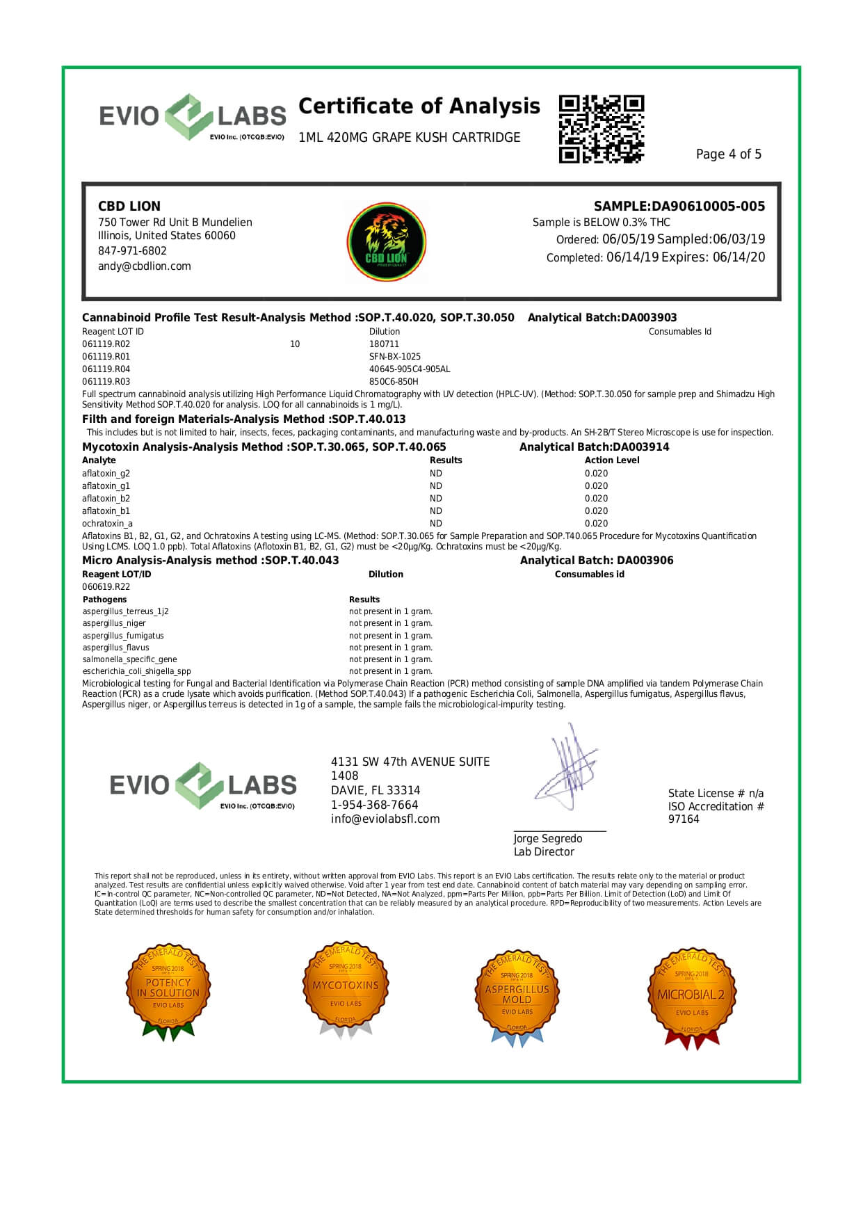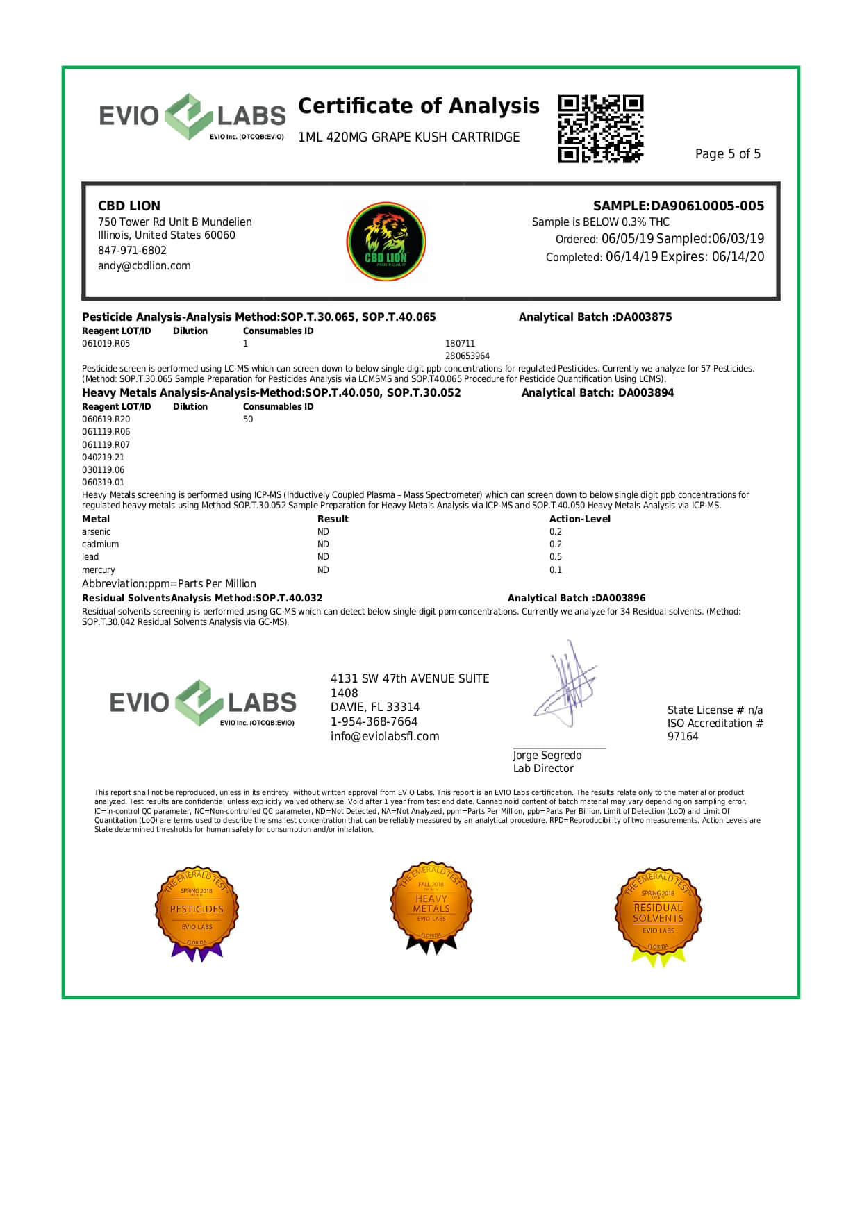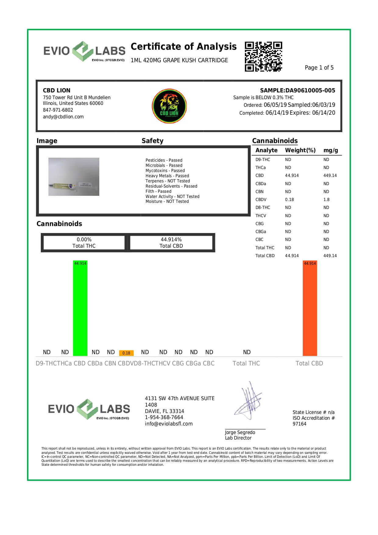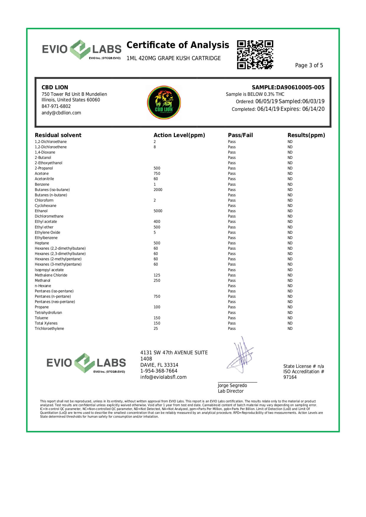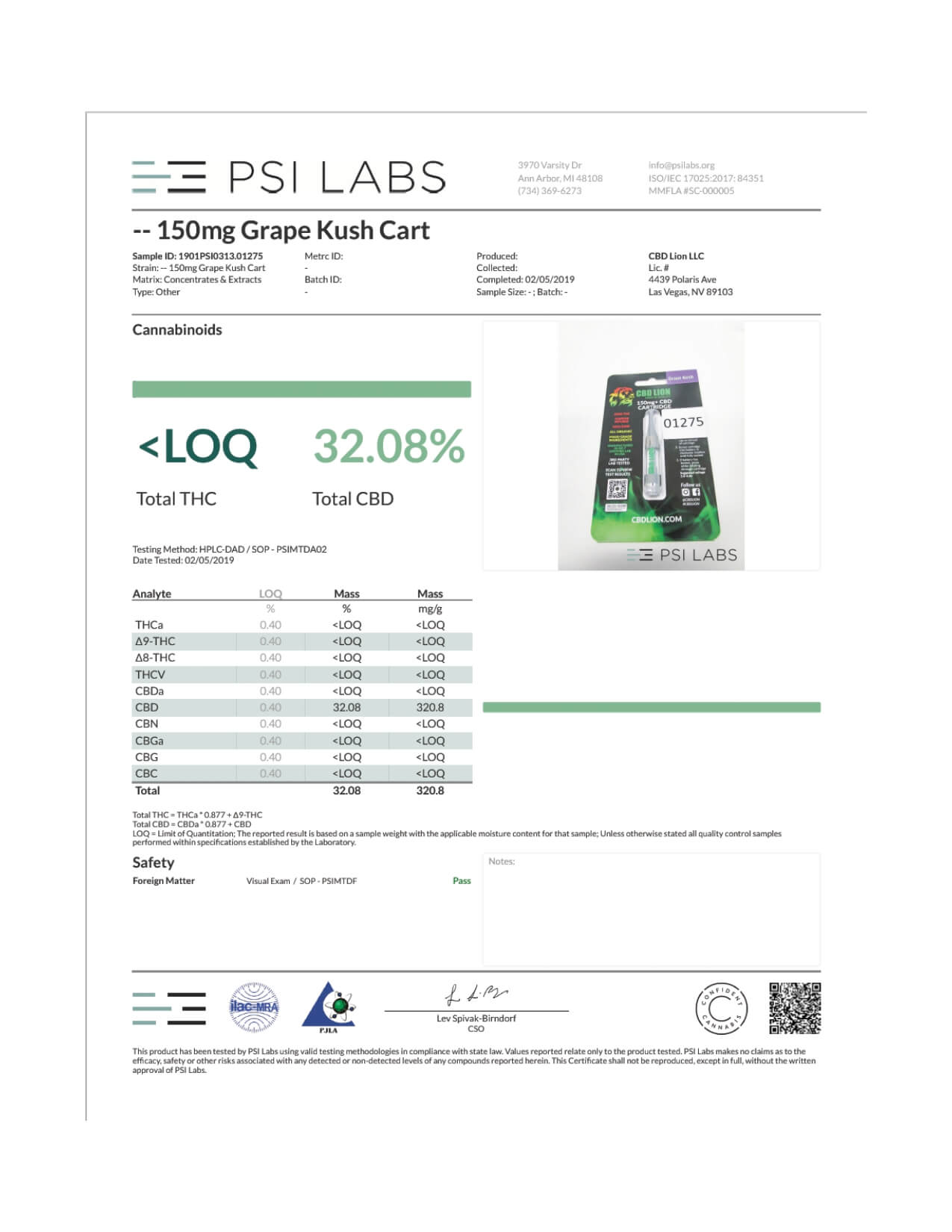 CBD Lion CBD Cartridge Grape Kush Lab Report important details about vaping products.