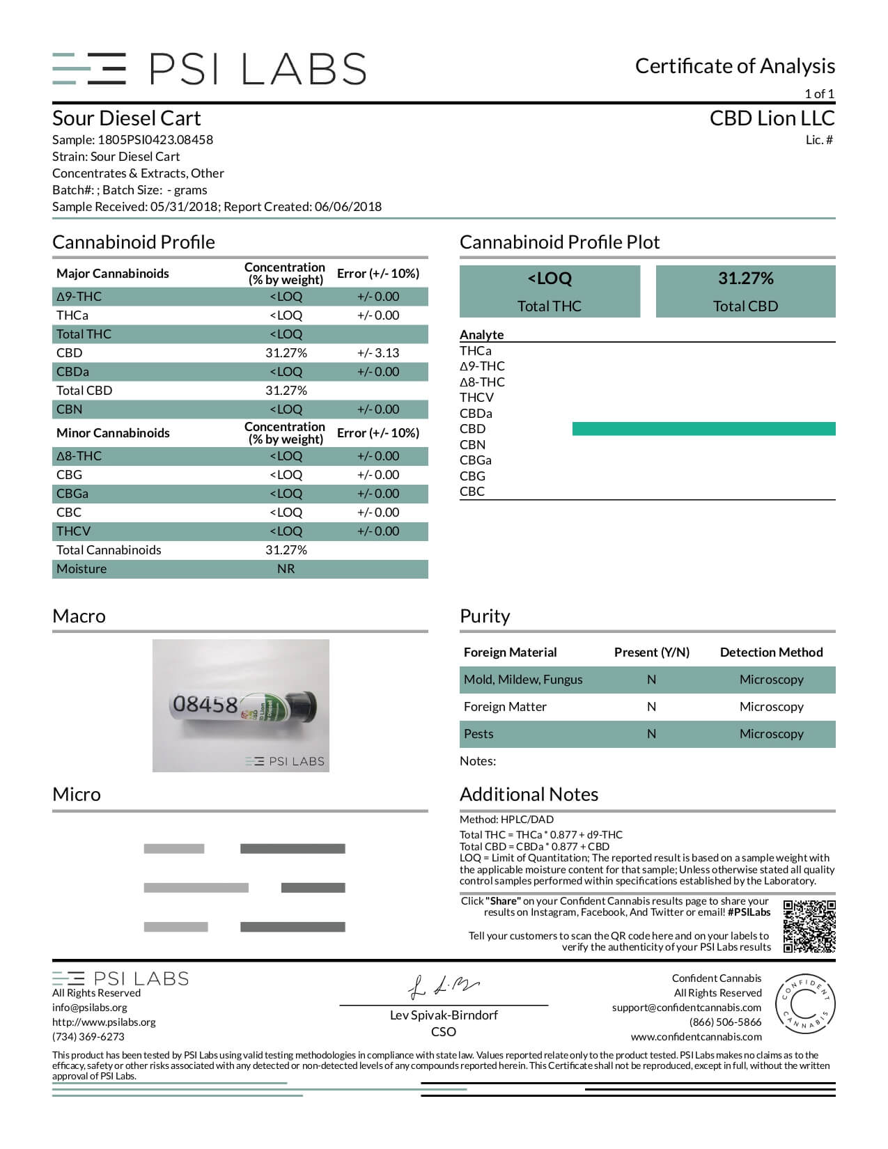 CBD Lion CBD Cartridge Sour Diesel Lab Report important details about vaping products.