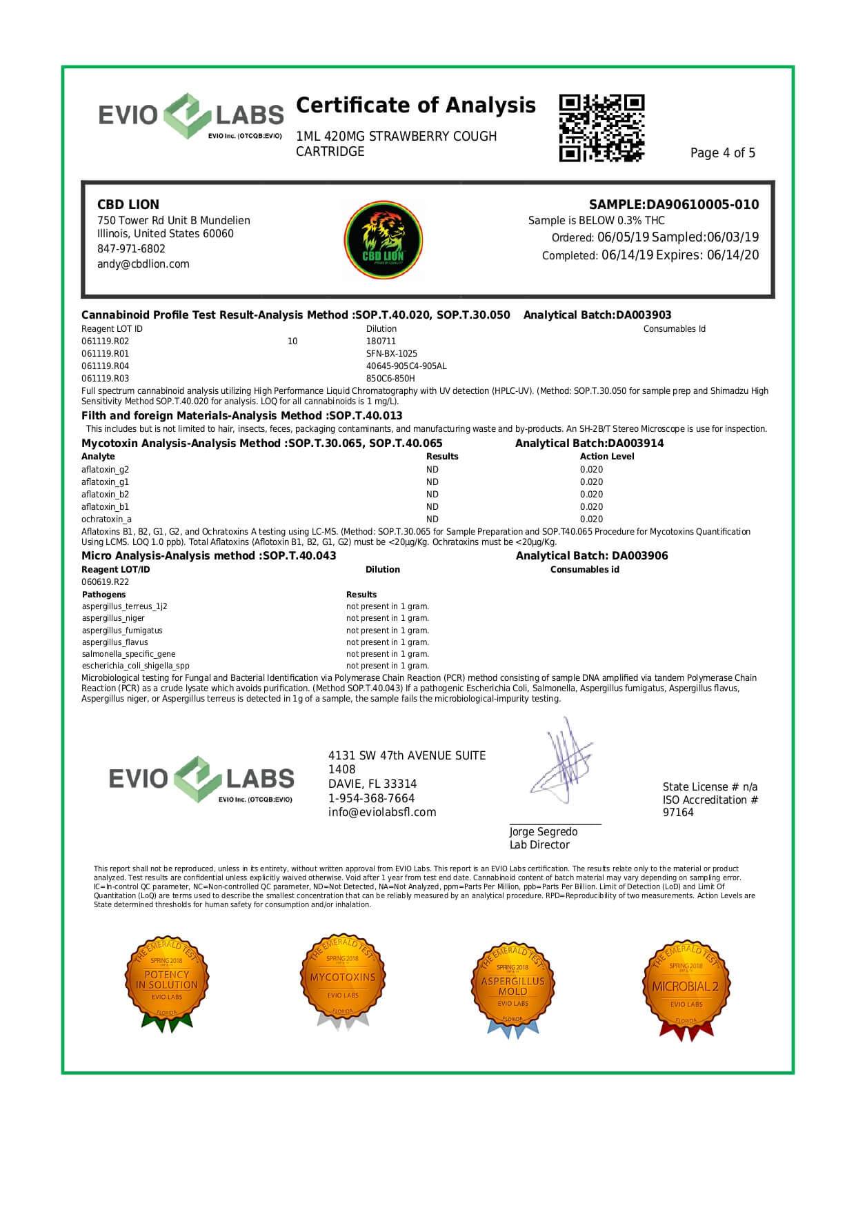 CBD Lion CBD Cartridge Strawberry Cough Lab Report important details about vaping products.