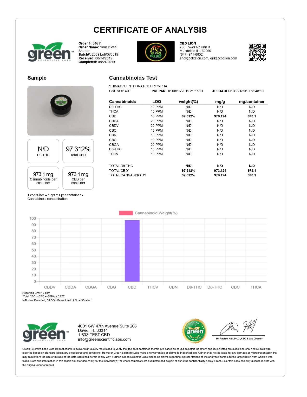 CBD Lion CBD Concentrate Sour Diesel Shatter Lab Report important details about vaping products.
