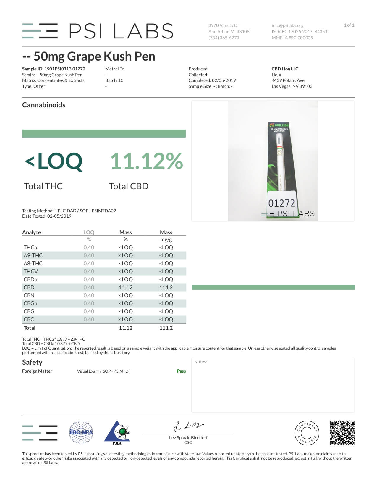 CBD Lion CBD Disposable Vape Pen Grape Kush Lab Report important details about vaping products.