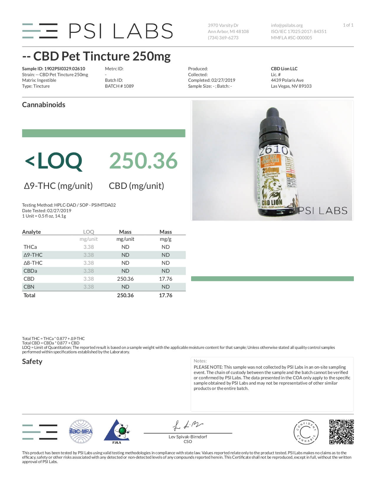 CBD Lion CBD Pet Tincture 250mg Lab Report