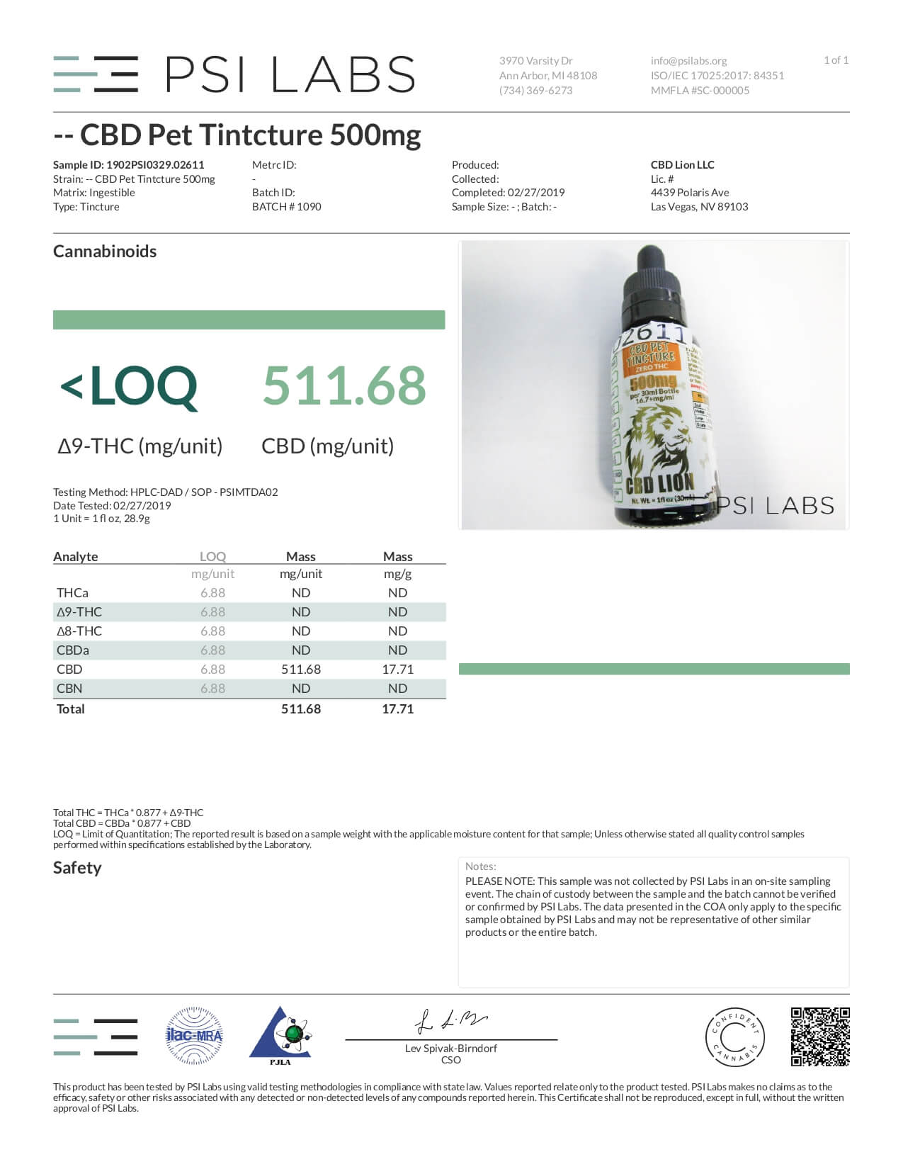 CBD Lion CBD Pet Tincture 500mg Lab Report