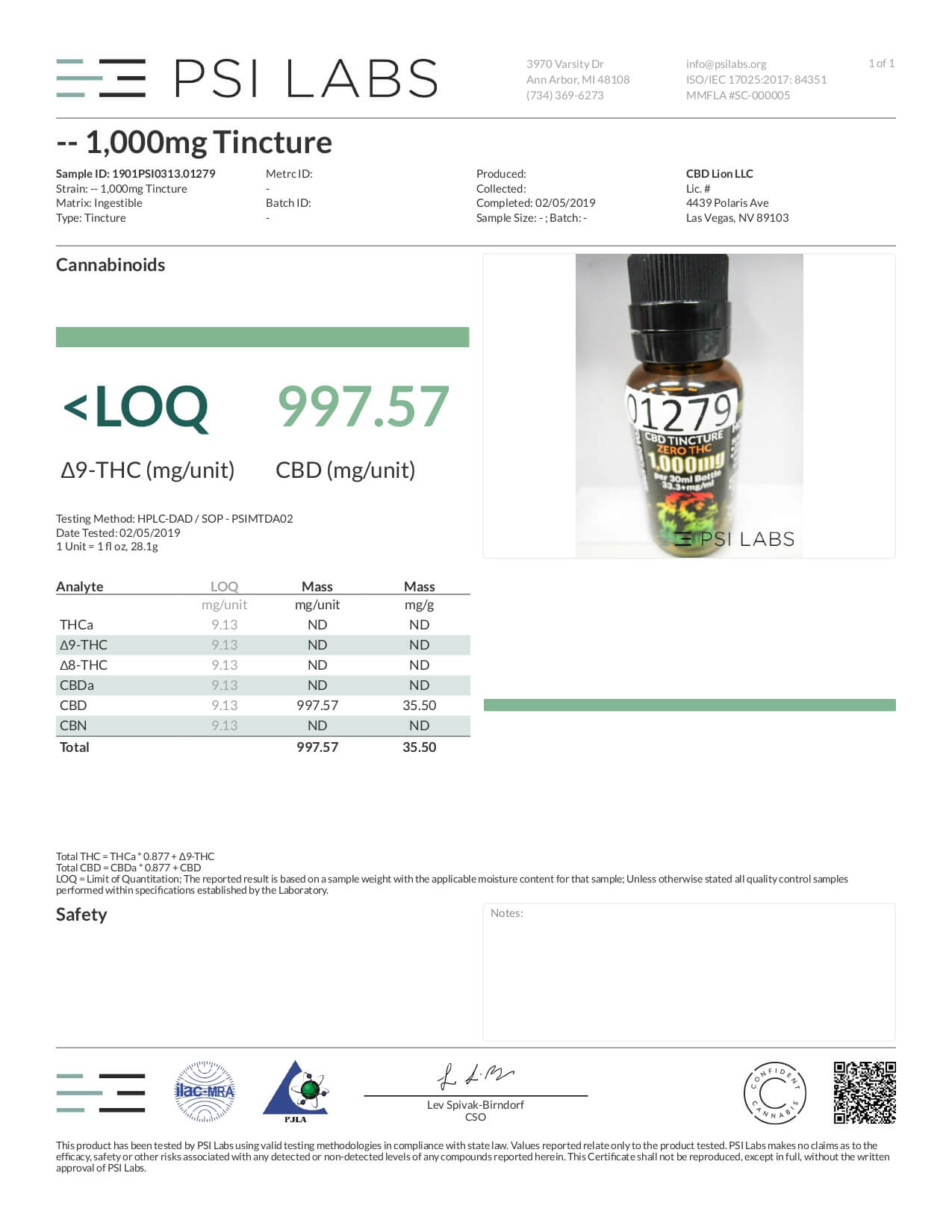 CBD Lion CBD Tincture Oil 1000mg Lab Report