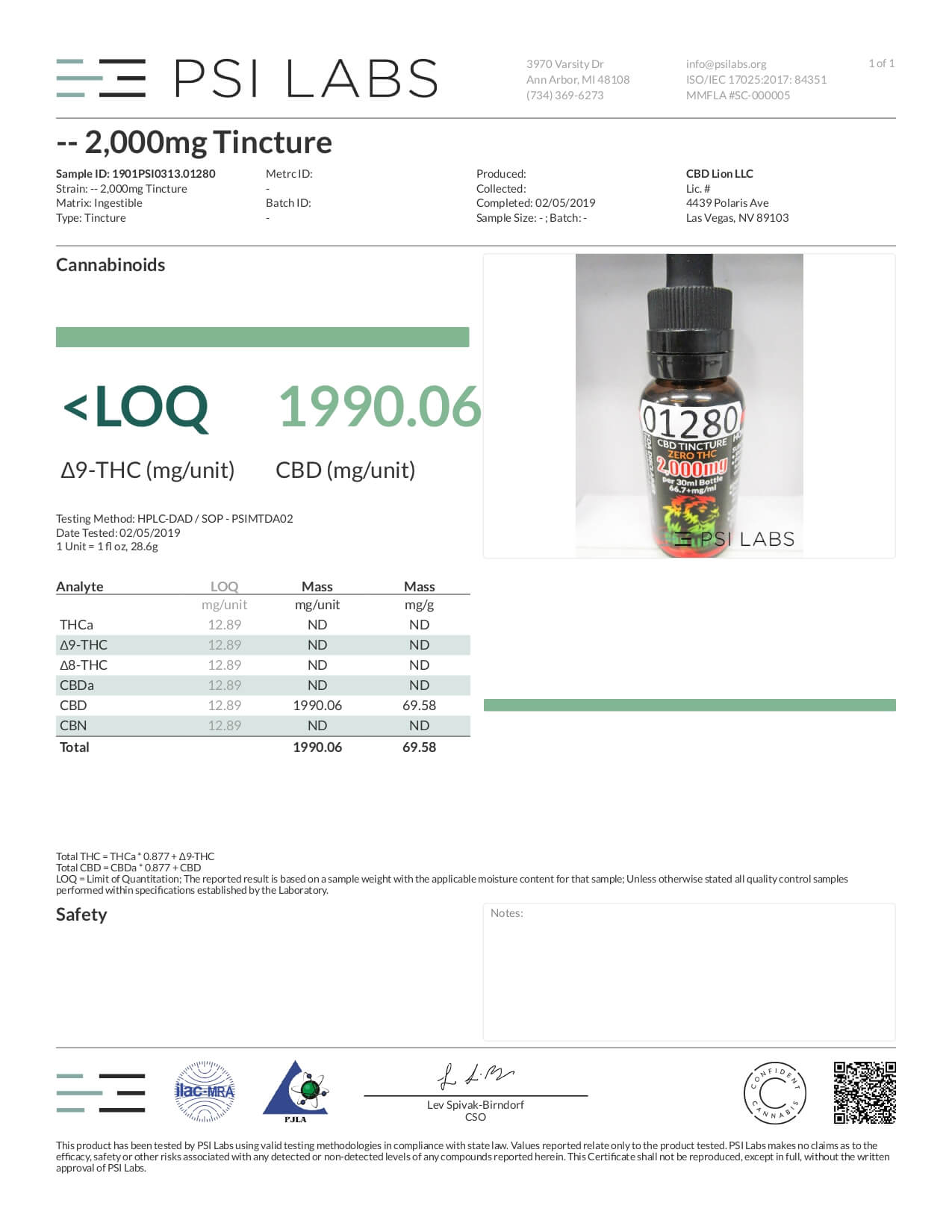 CBD Lion CBD Tincture Oil 2000mg Lab Report