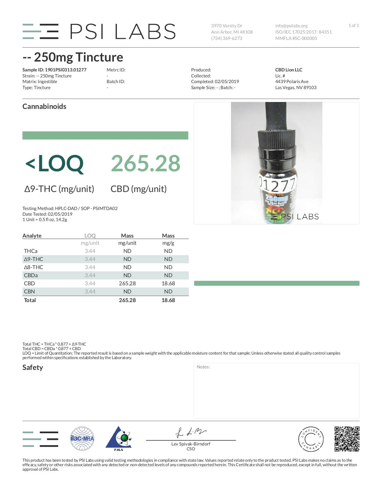 CBD Lion CBD Tincture Oil 250mg Lab Report