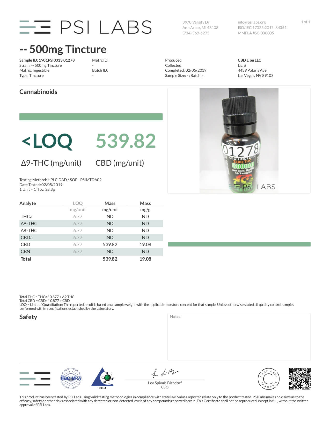 CBD Lion CBD Tincture Oil 500mg Lab Report