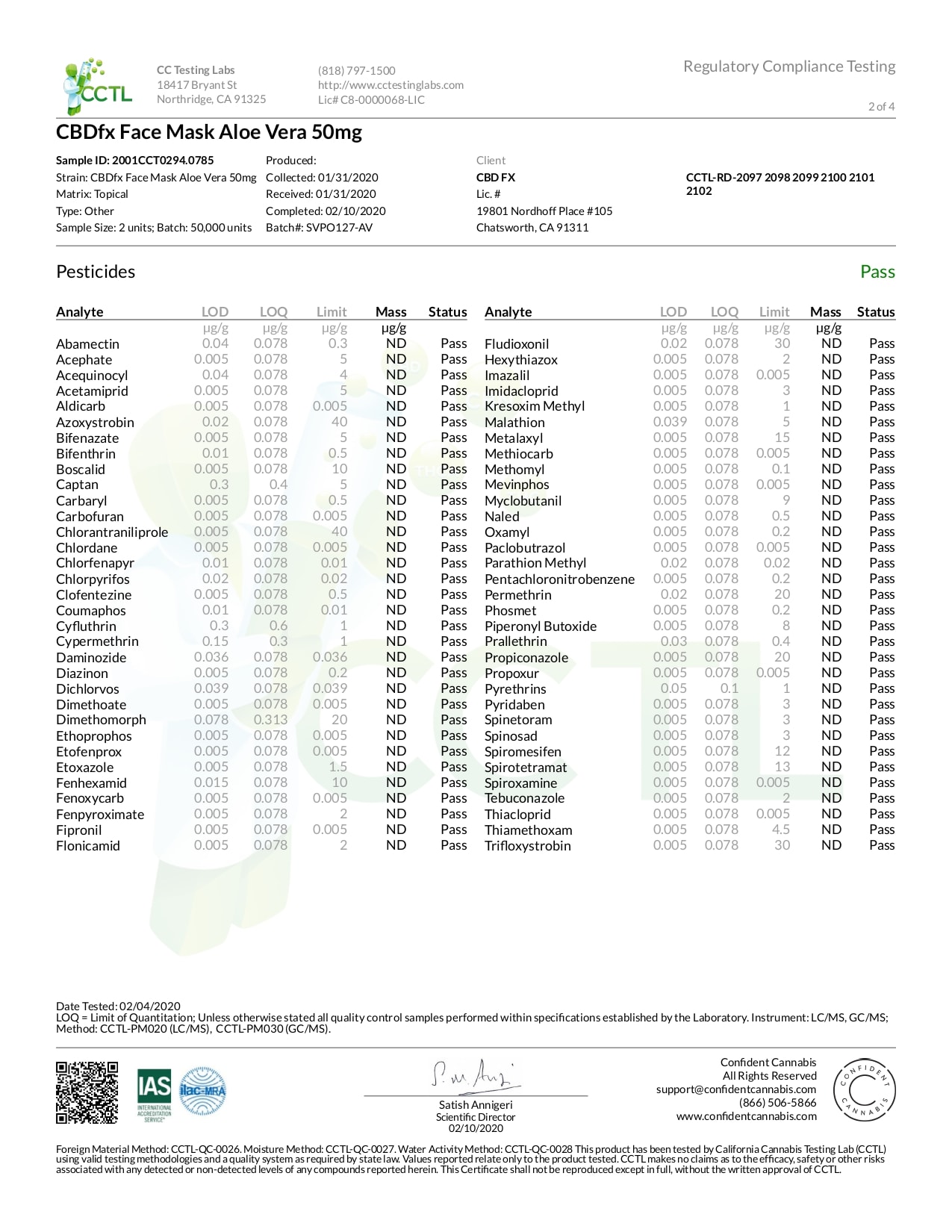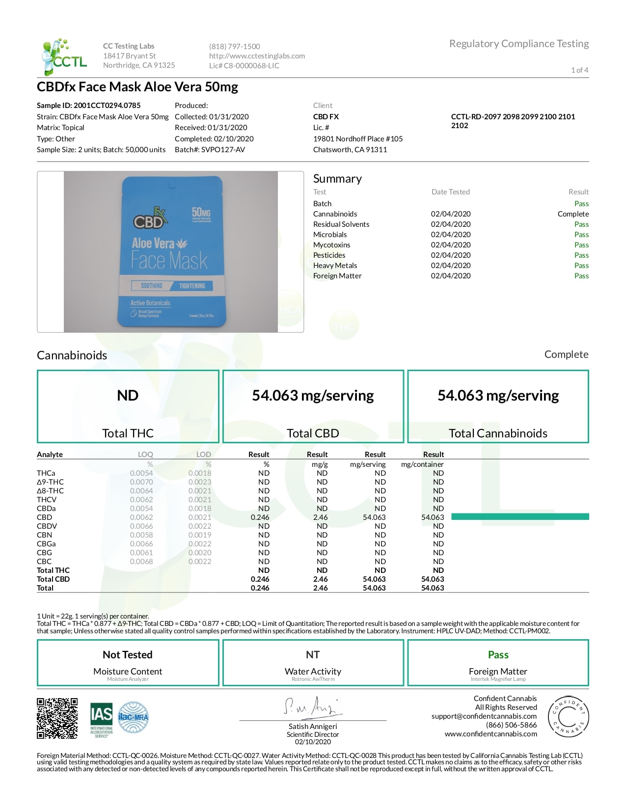CBDfx Broad Spectrum CBD Aloe Vera Face Mask Lab Reports test results with reference to CBD products.