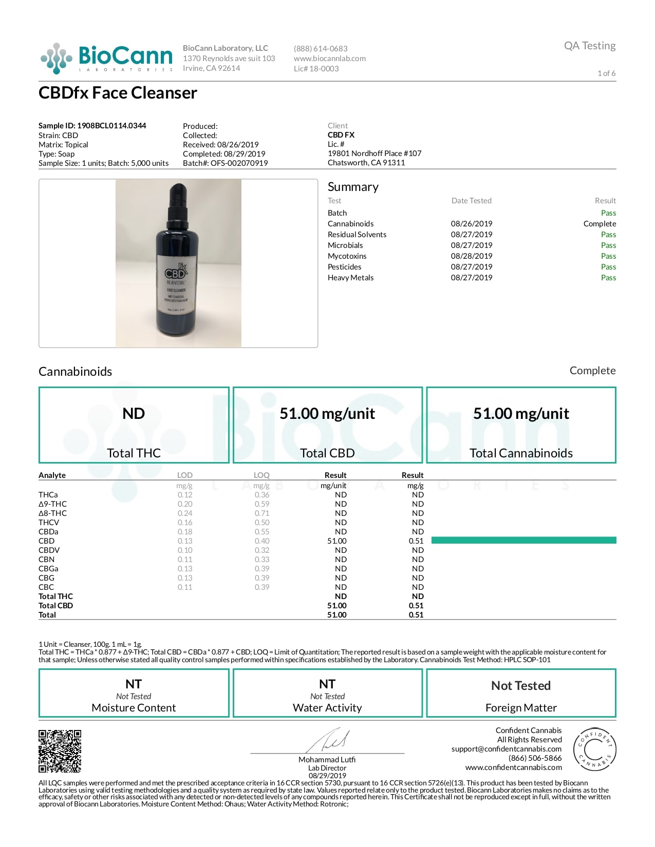 CBDfx Broad Spectrum CBD Face Cleanser Rejuvediol Lab Reports test results with reference to CBD products.