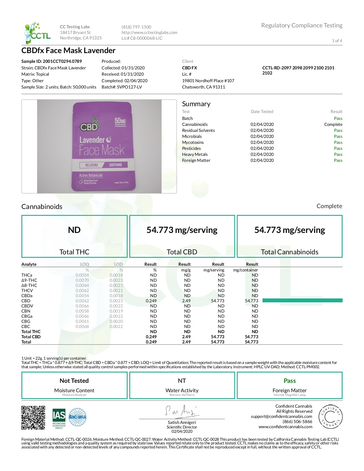 CBDfx CBD Lavender Face Mask Lab Report Broad Spectrum 50mg