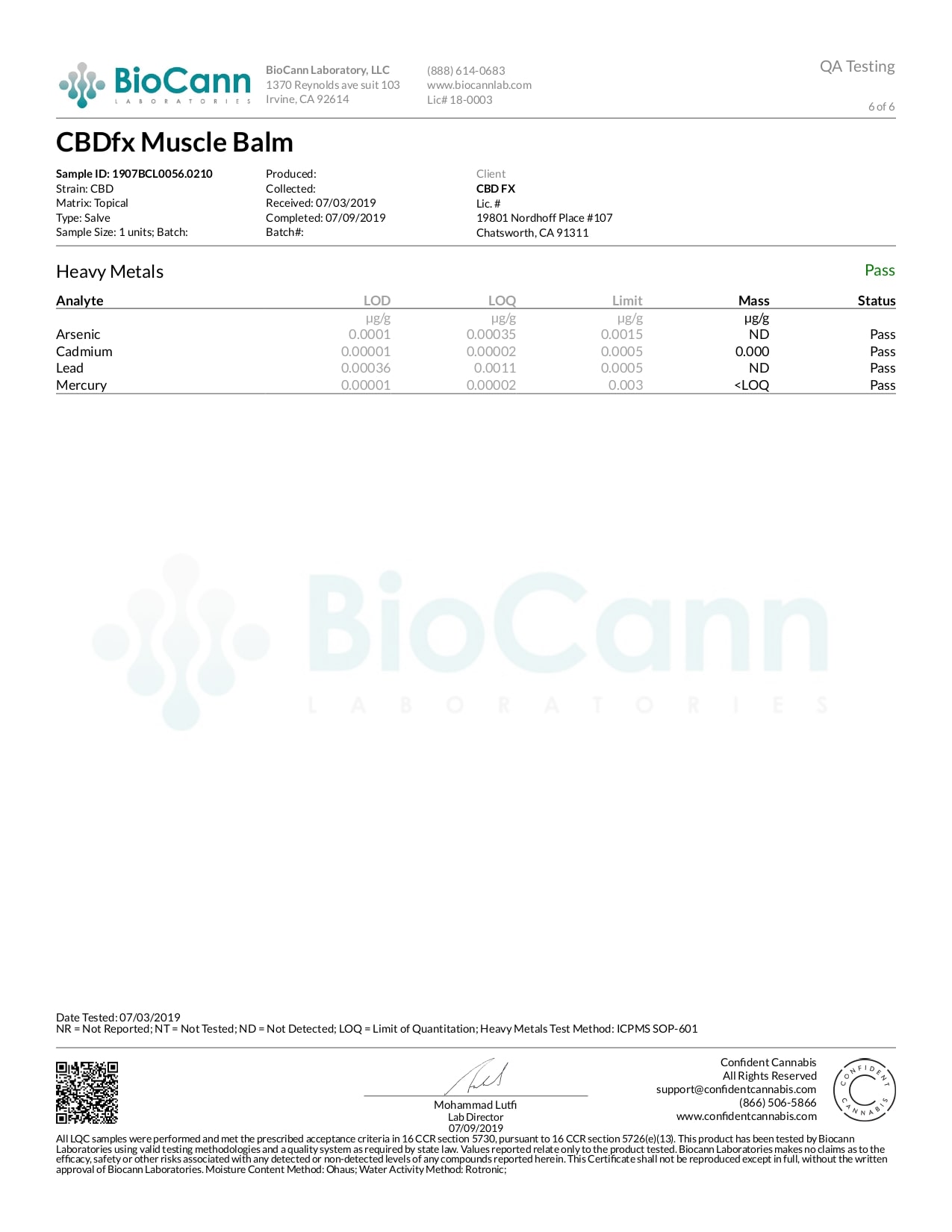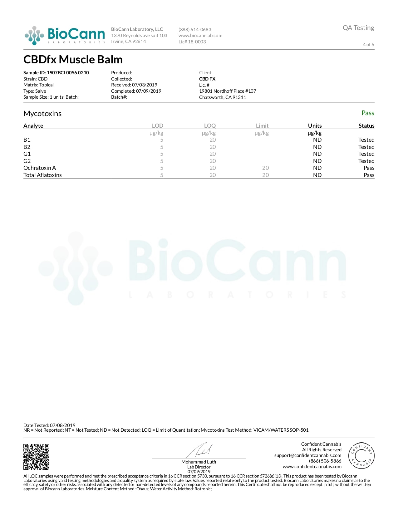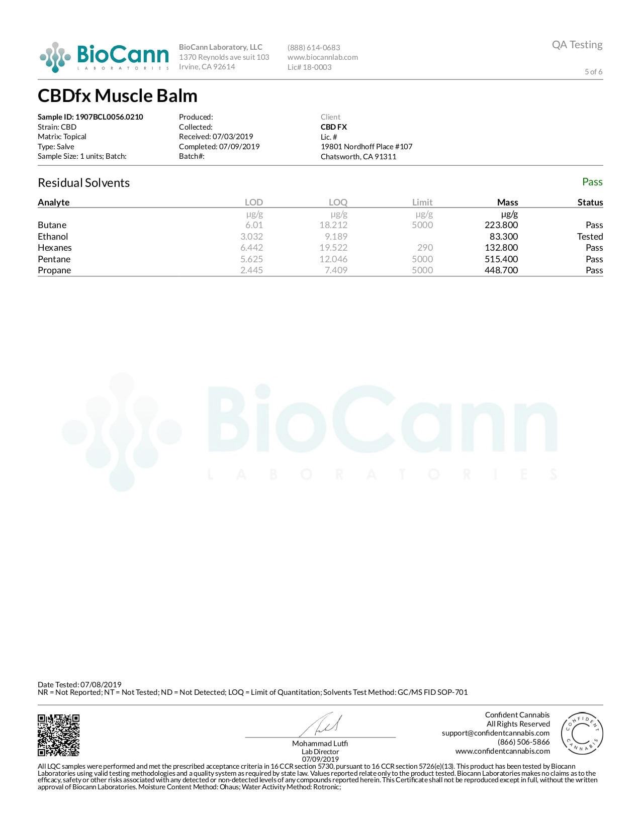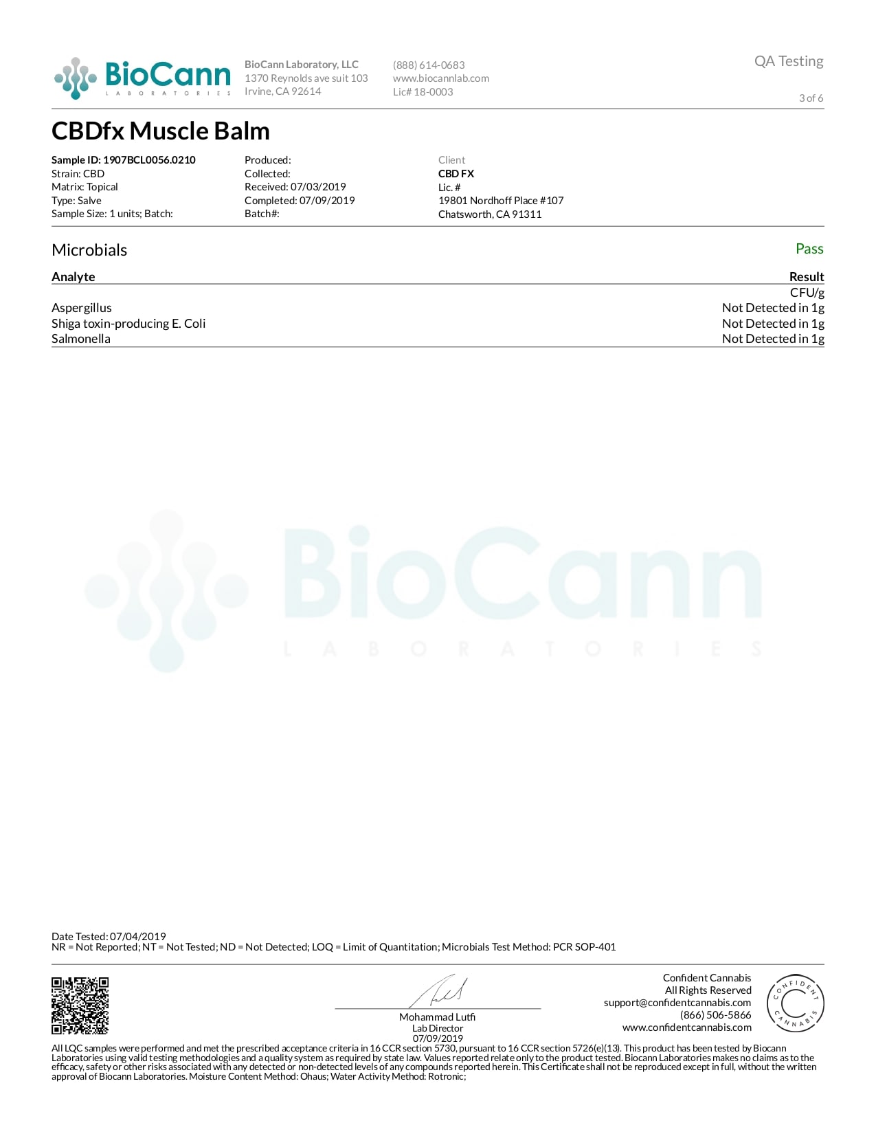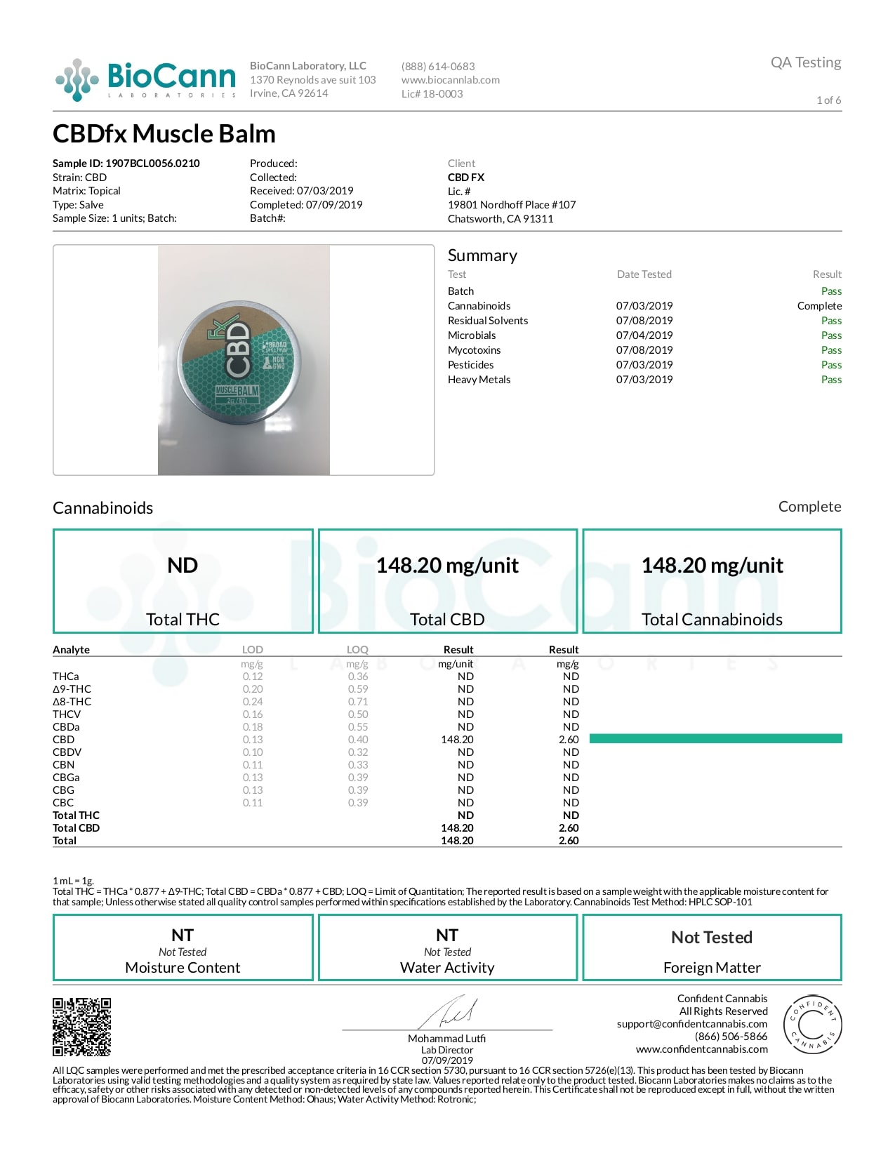 CBDfx Broad Spectrum CBD Muscle Balm Lab Report test results with reference to CBD products.
