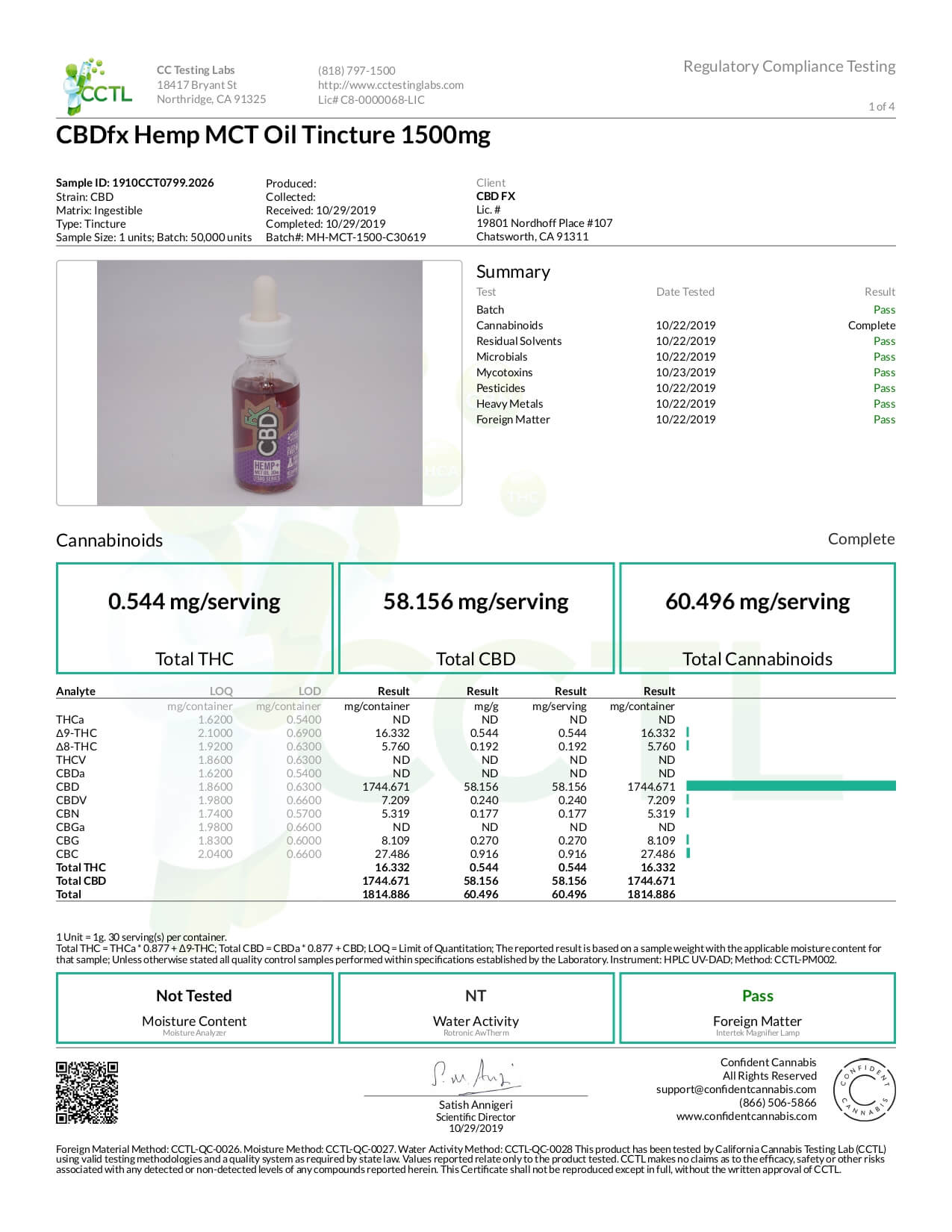CBDfx CBD Tincture Oil Lab Report Full Spectrum 1500mg