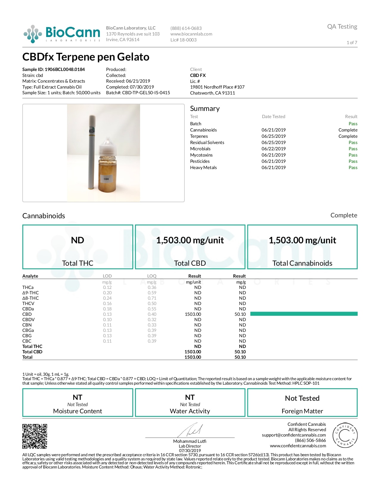 CBDfx Gelato Lab Report CBD Terpenes Vape Pen 50mg