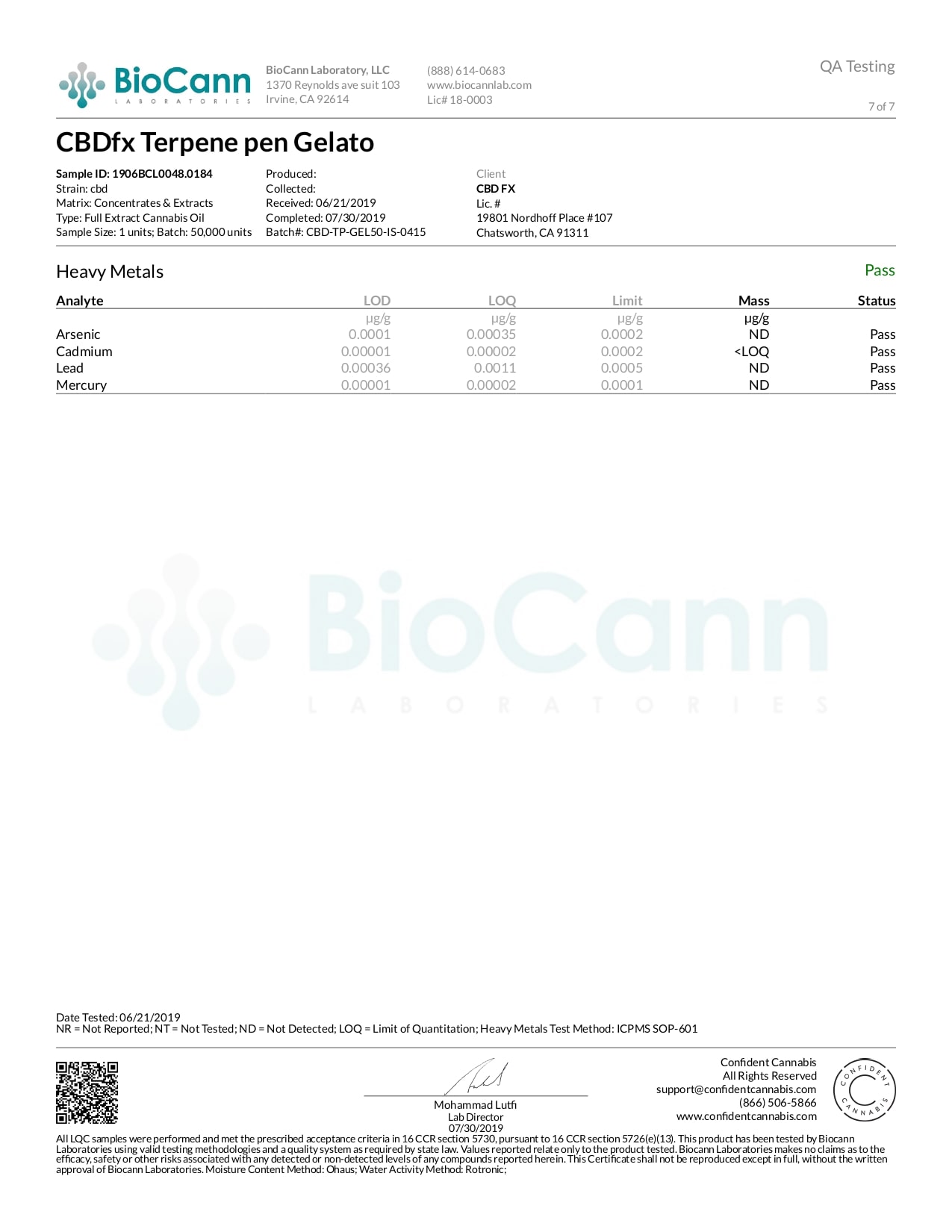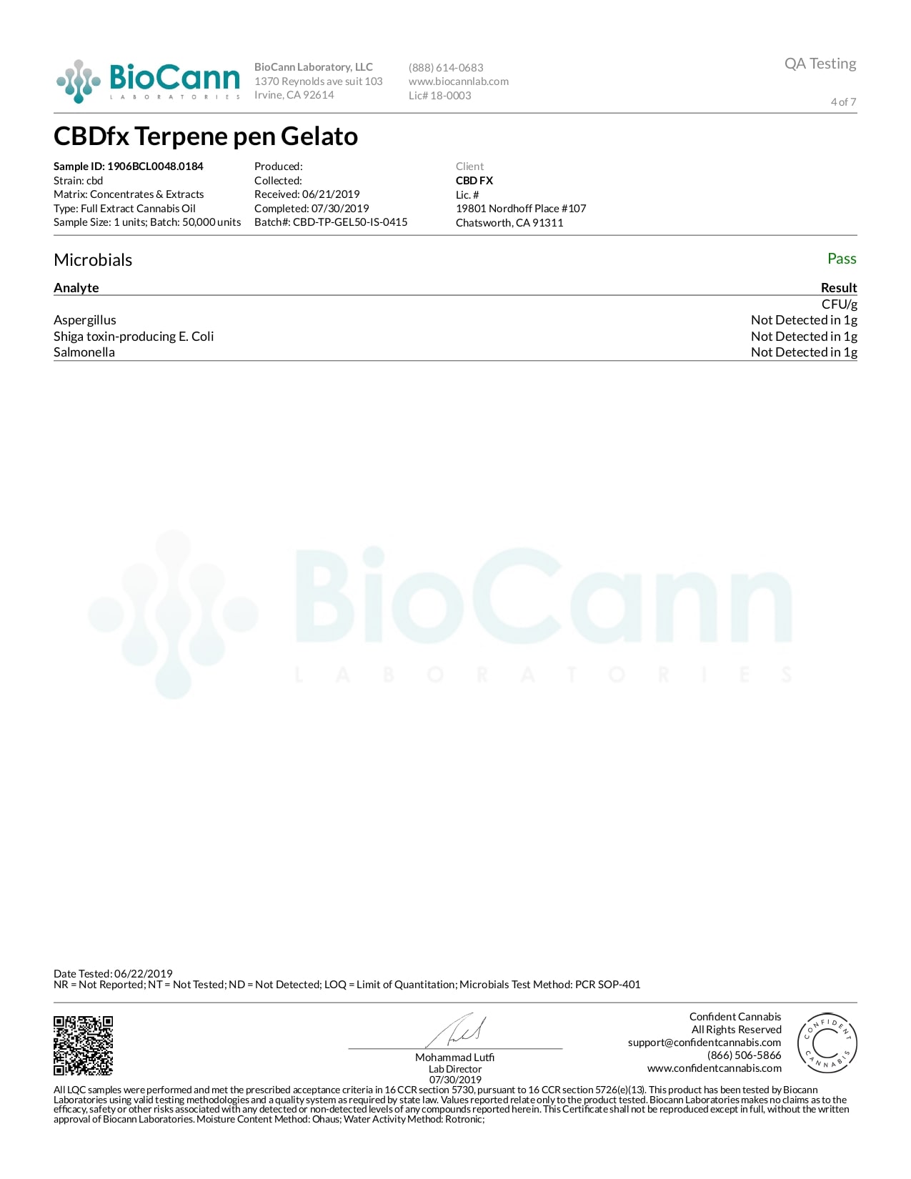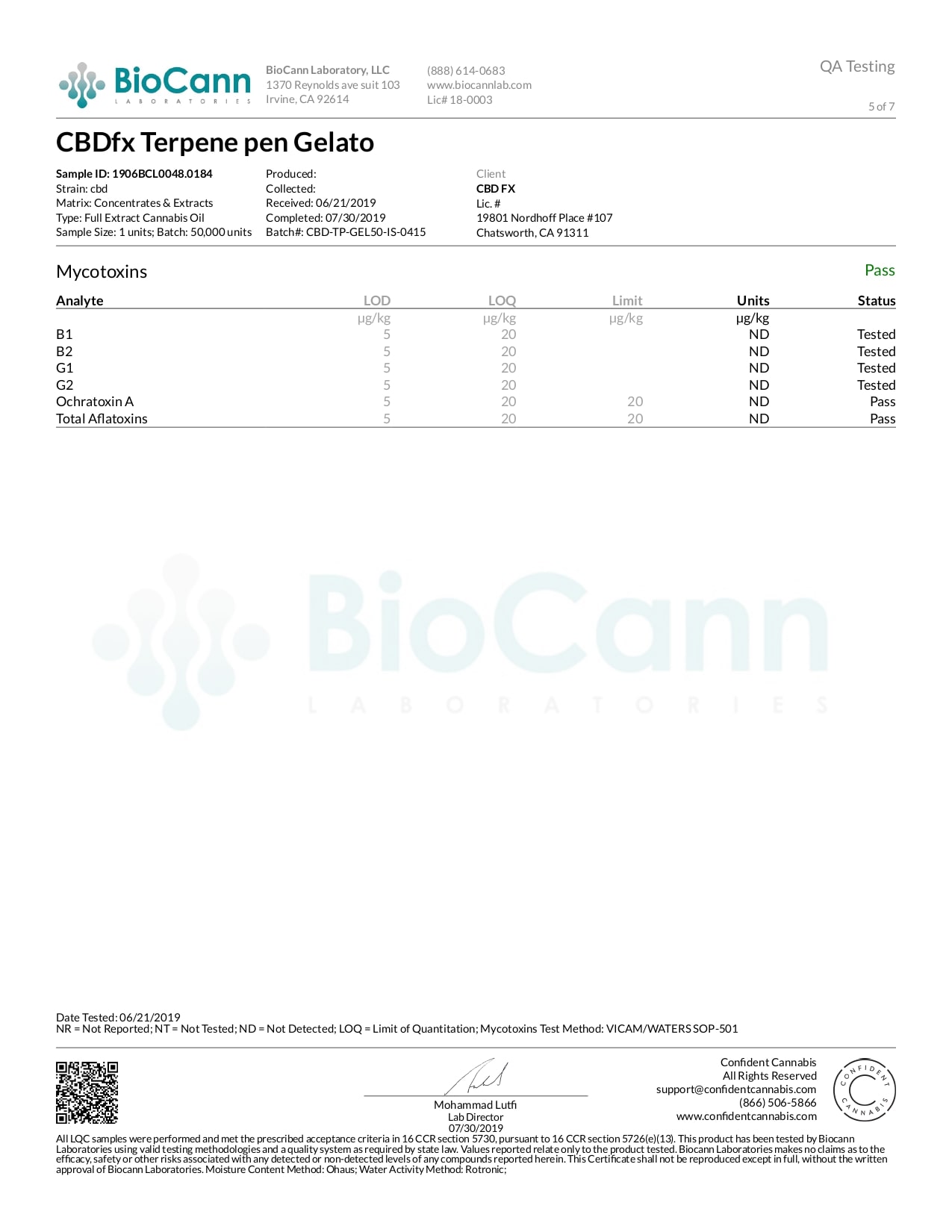 CBDfx Gelato CBD Terpenes Vape Pen Lab Reports test results with reference to CBD products.