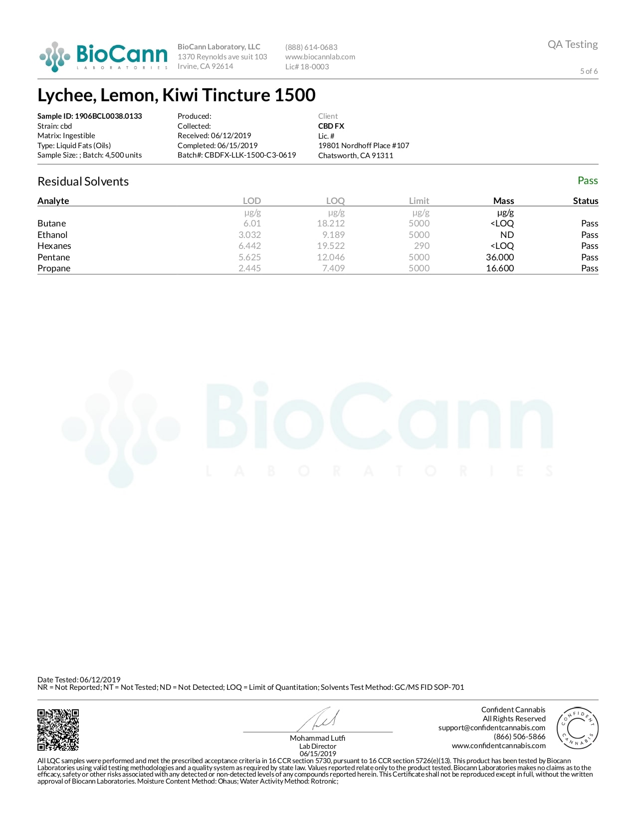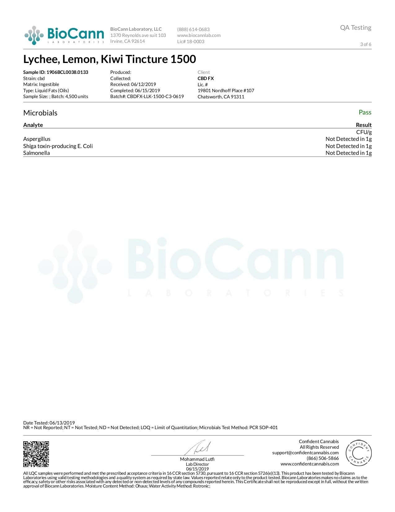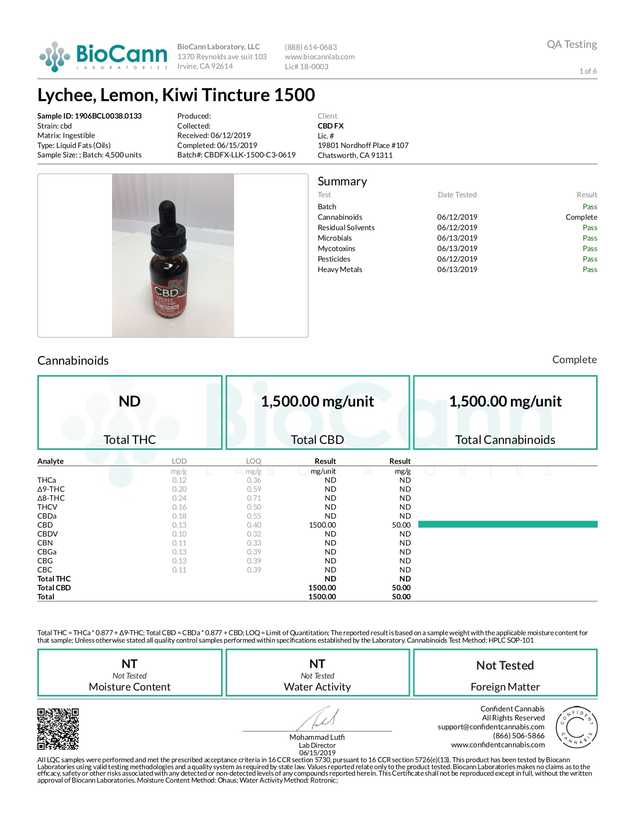 CBDfx Lychee Lemon Kiwi Lab Report CBD Oil Tincture 1500mg