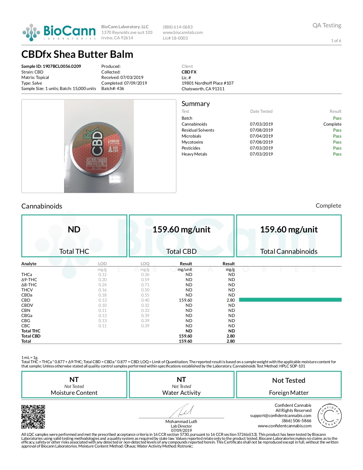 CBDfx CBD Balm Lab Report Moisturizing 150mg