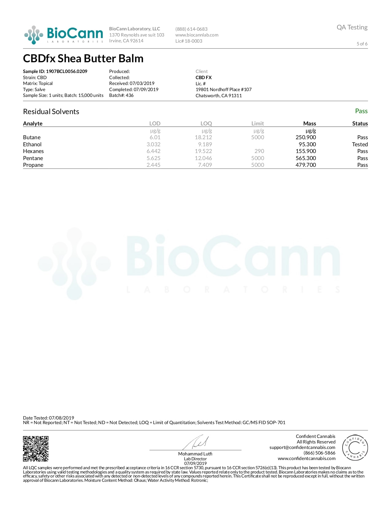 CBDfx Moisturizing CBD Balm Lab Reports test results with reference to CBD products.