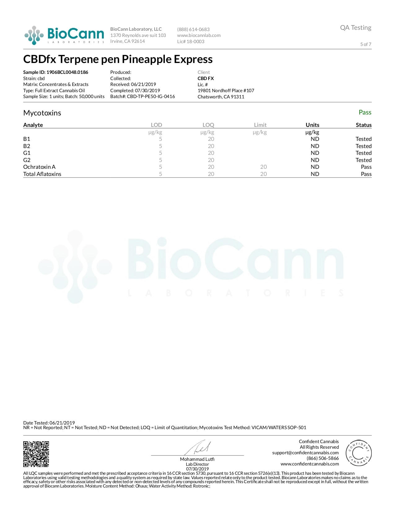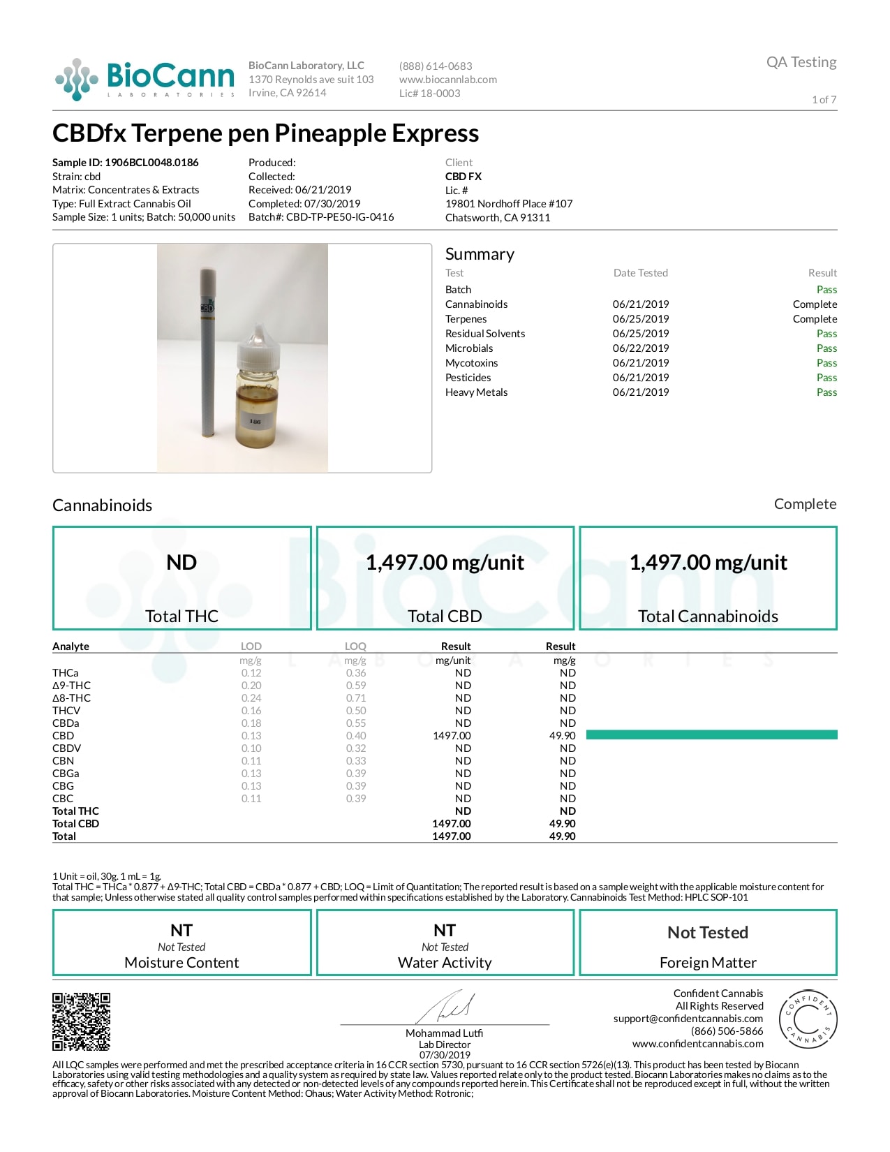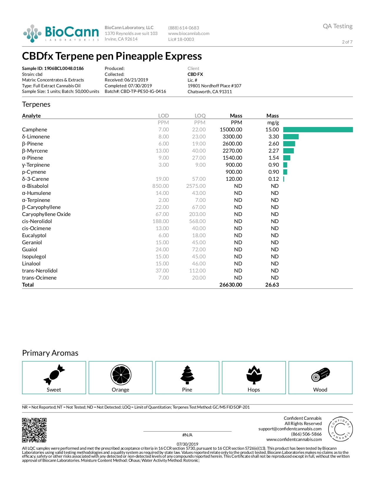 CBDfx Pineapple Express CBD Terpenes Vape Pen Lab Reports test results with reference to CBD products.