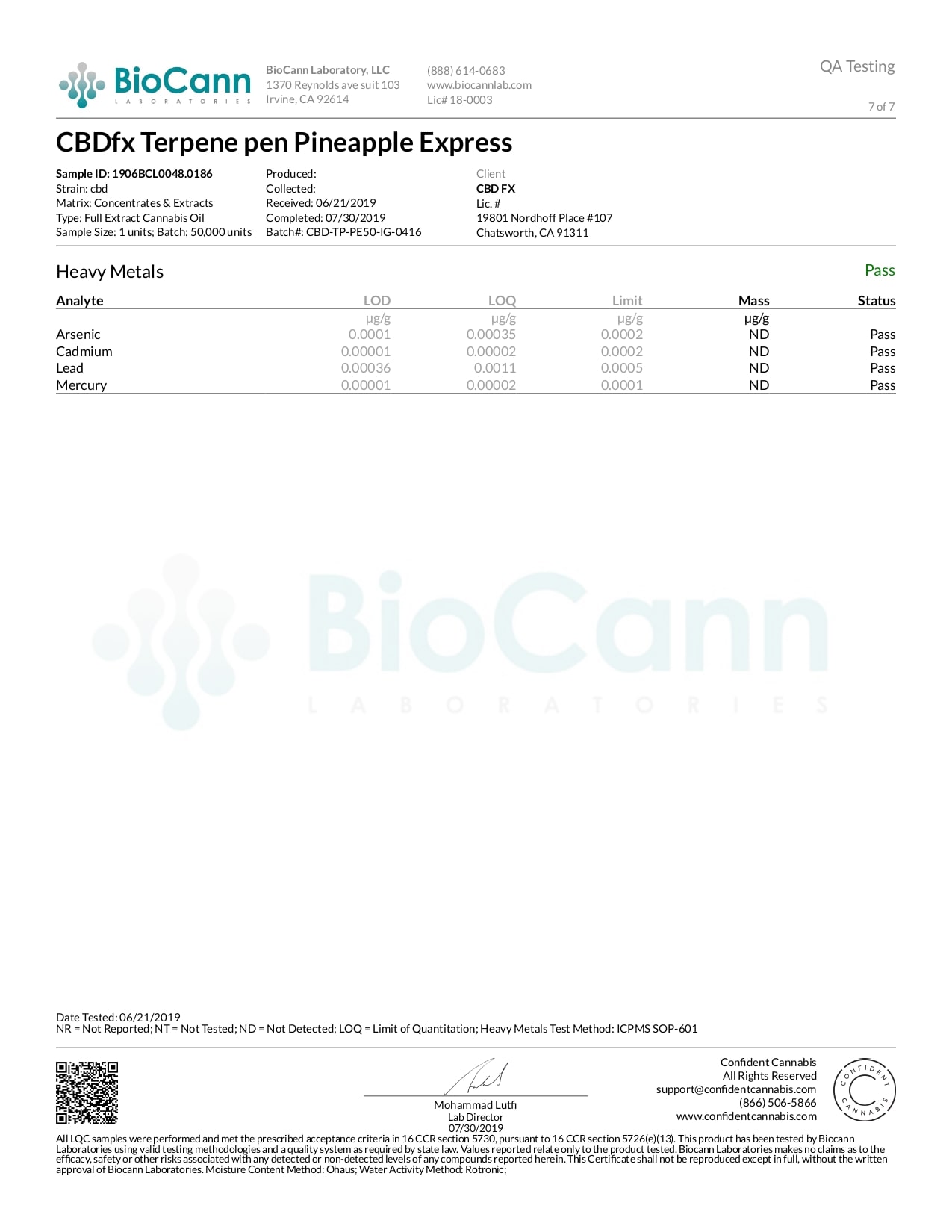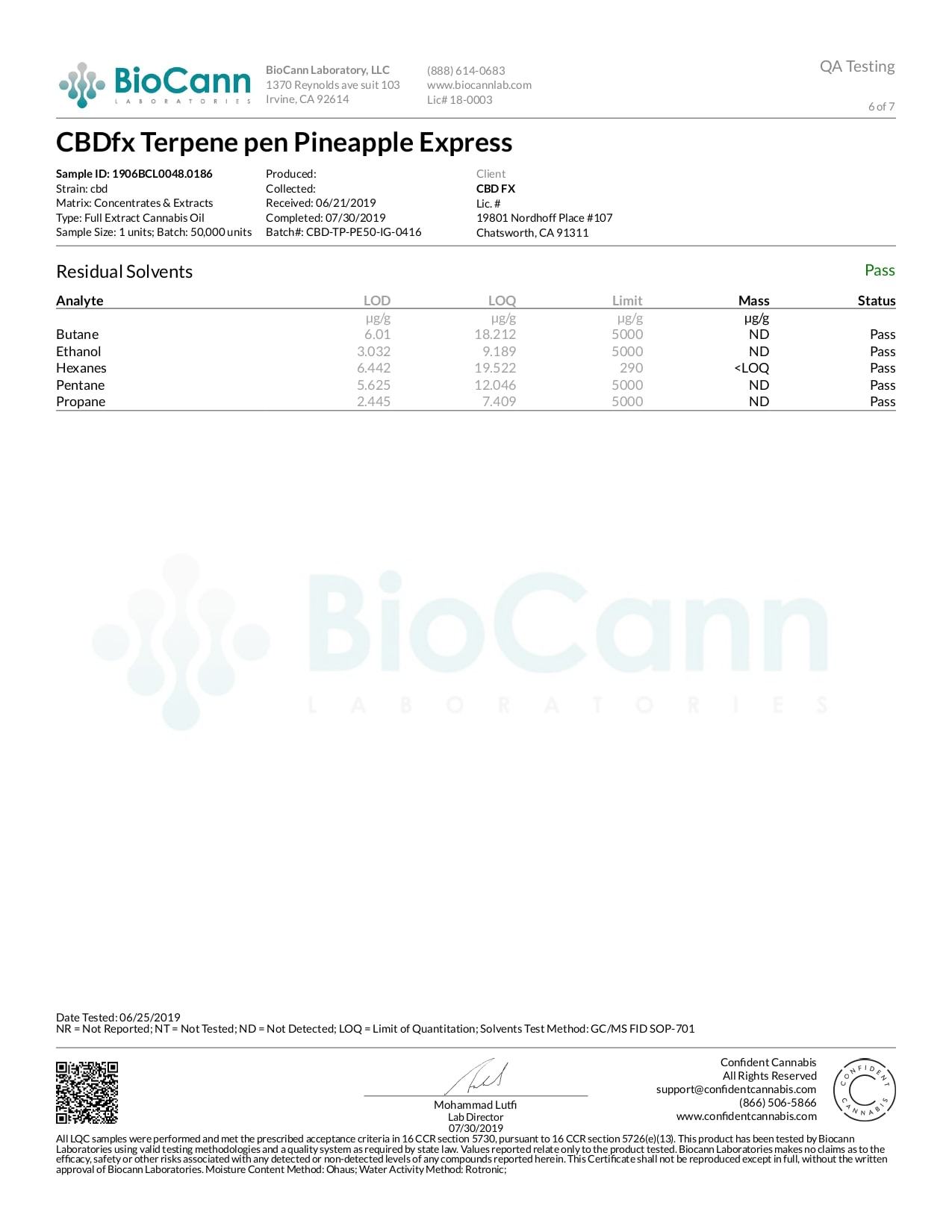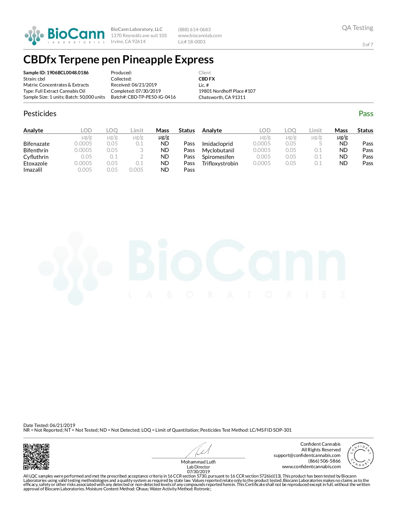 CBDfx Pineapple Express CBD Terpenes Vape Pen Lab Reports test results with reference to CBD products.