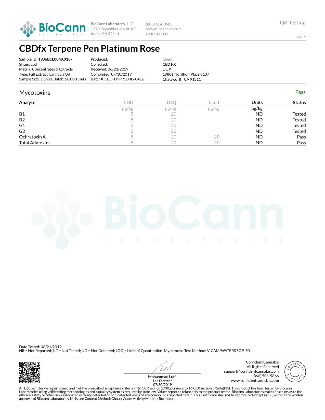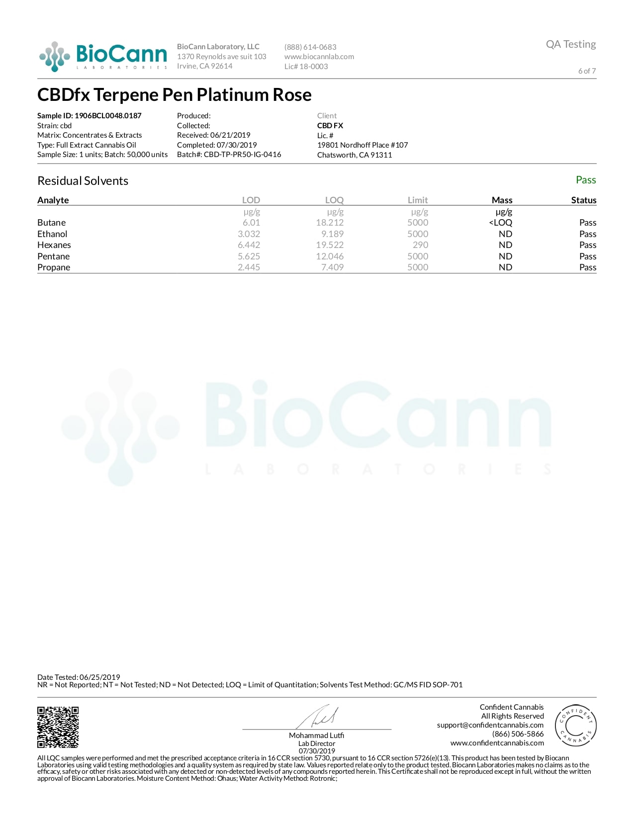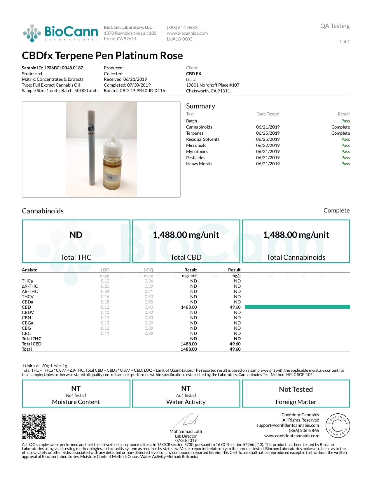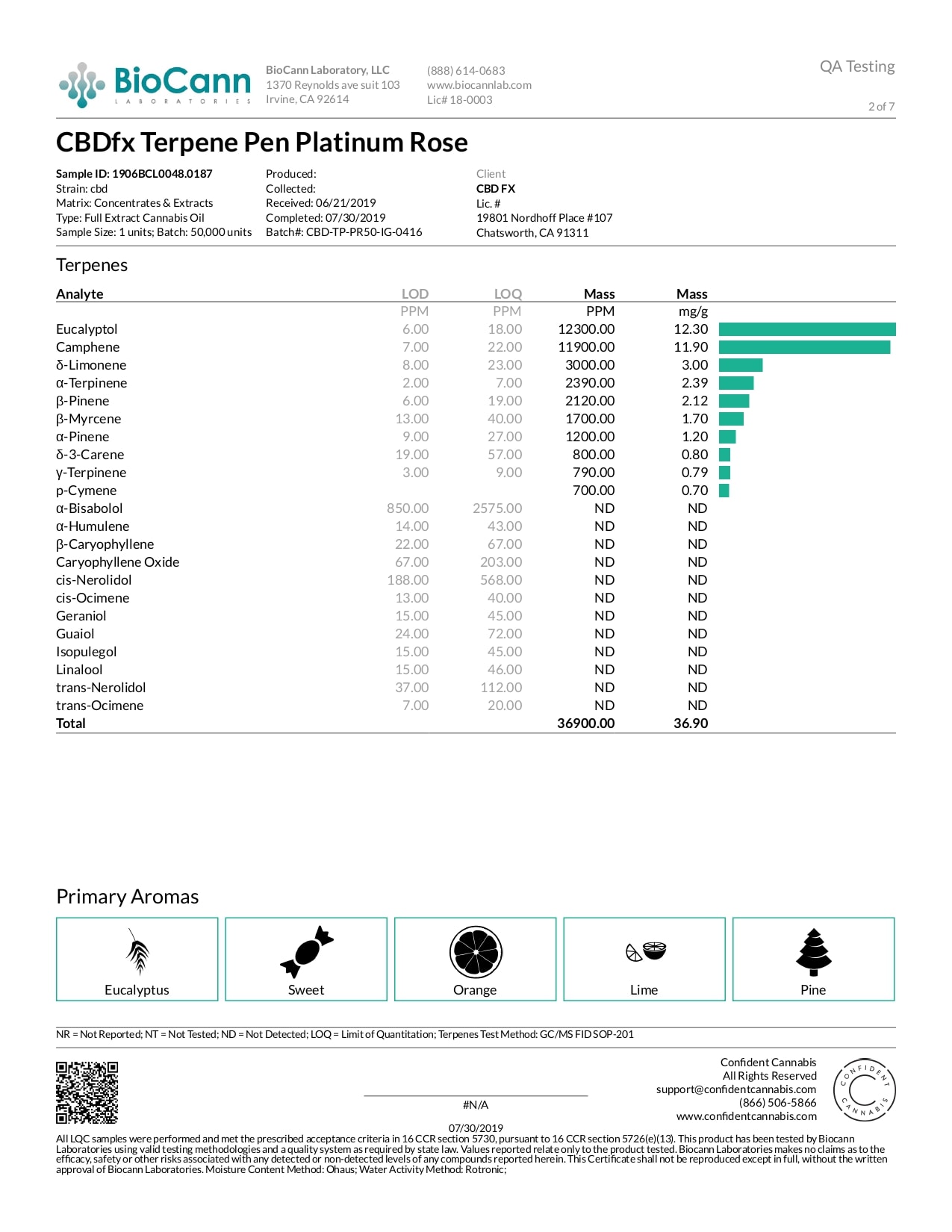 CBDfx Platinum Rose Lab Report CBD Terpenes Vape Pen 50mg