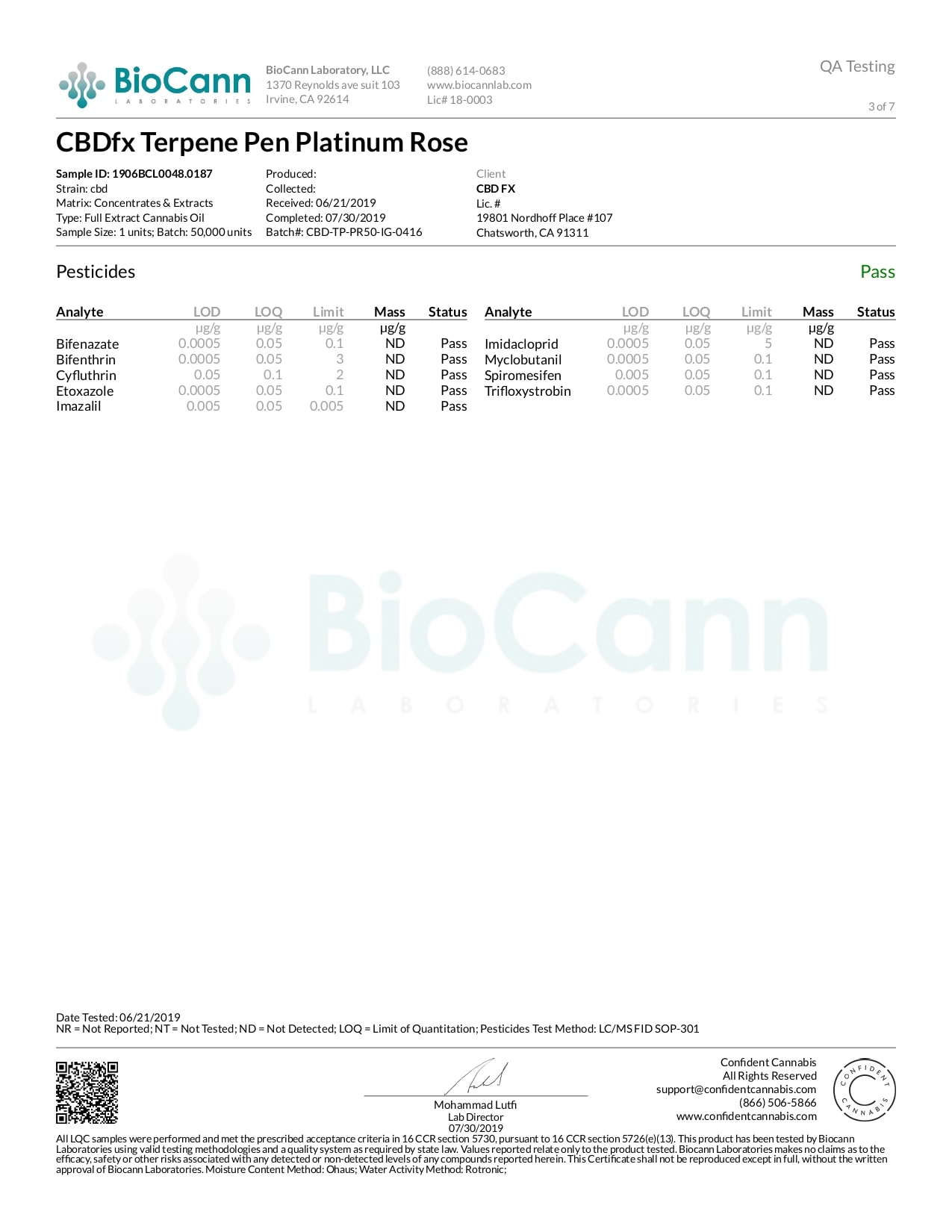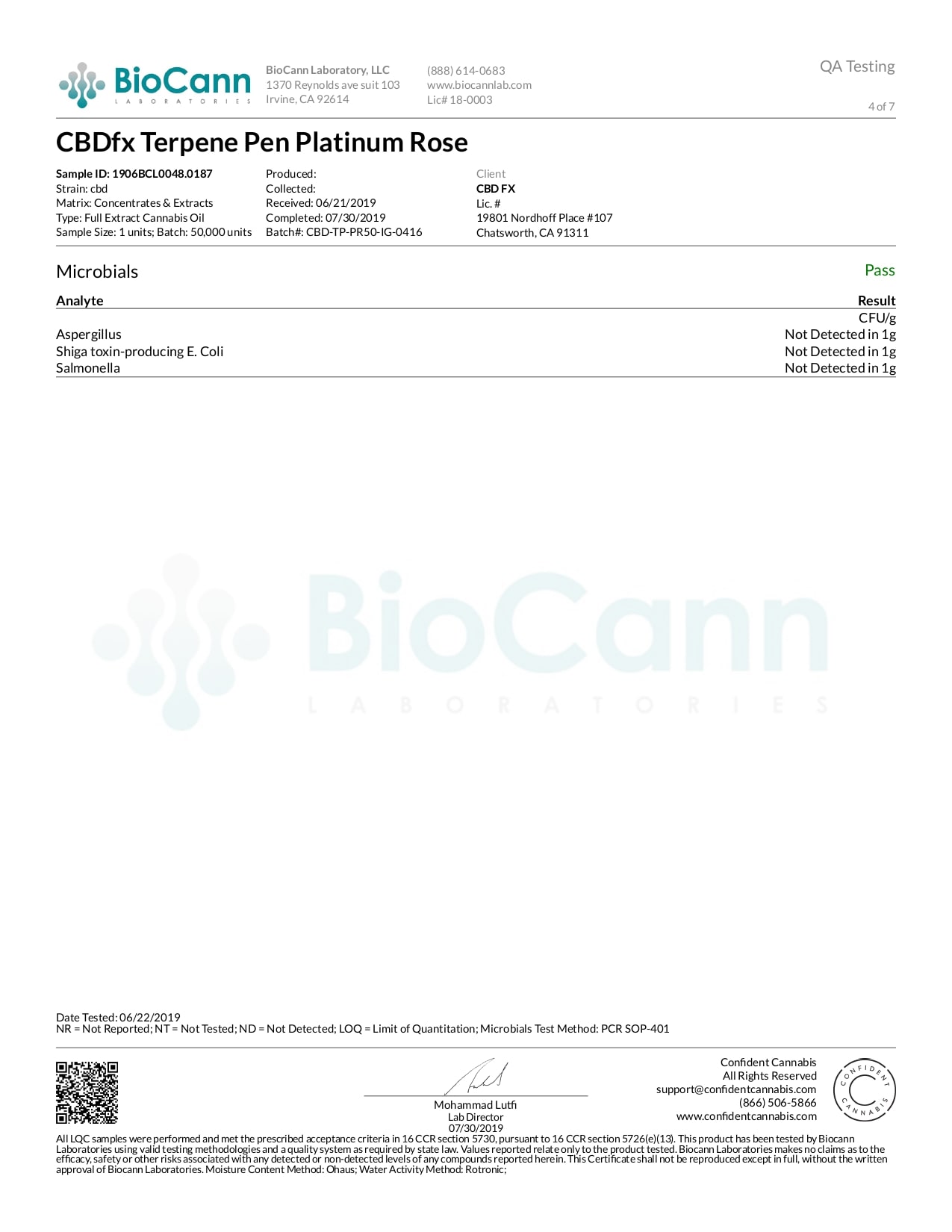 CBDfx Platinum Rose CBD Terpenes Vape Pen Lab Reports test results with reference to CBD products.