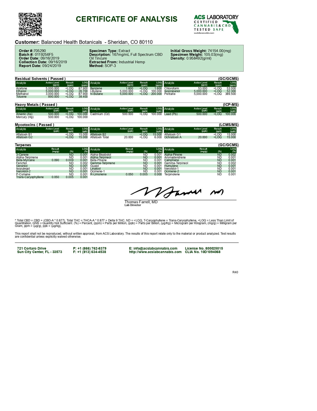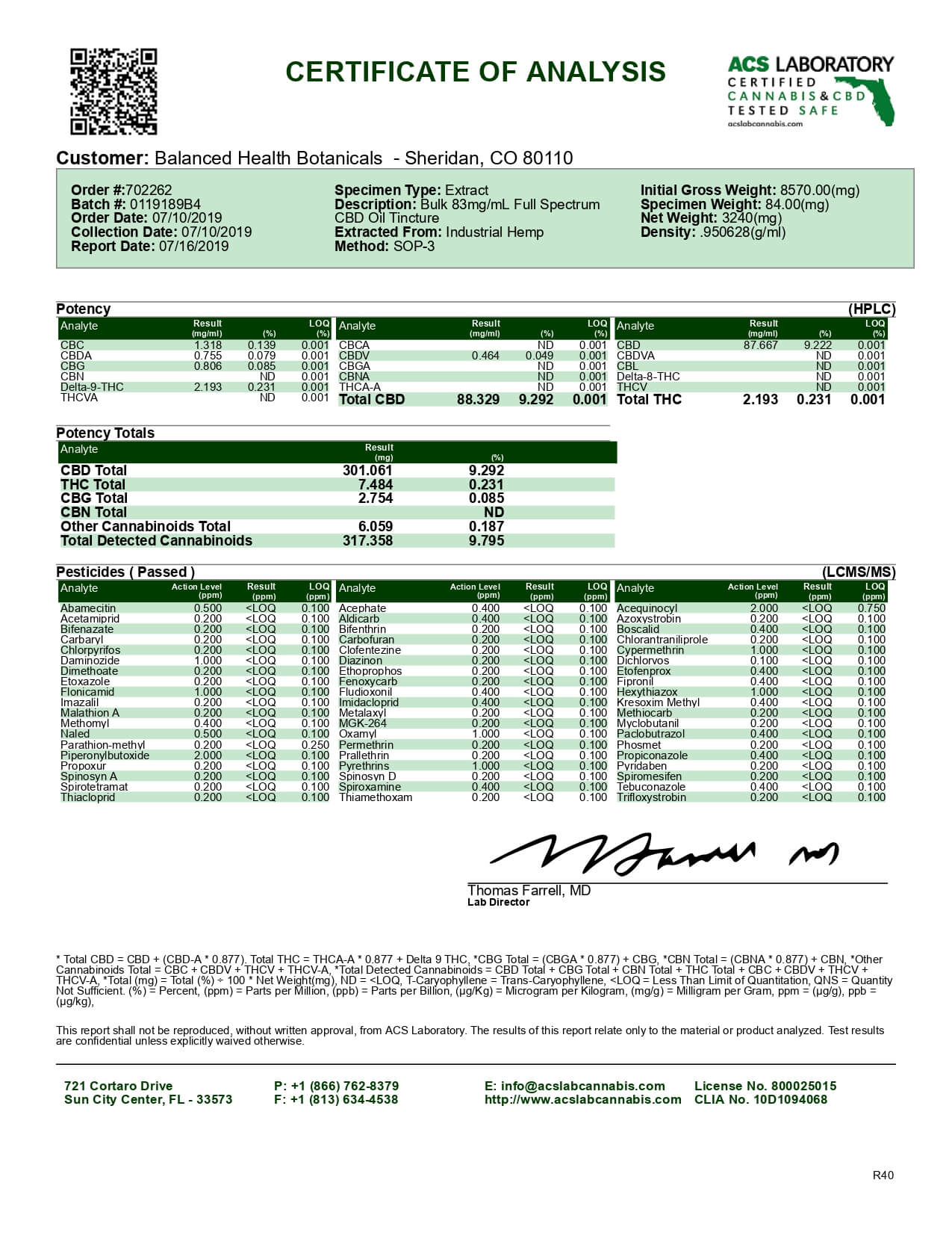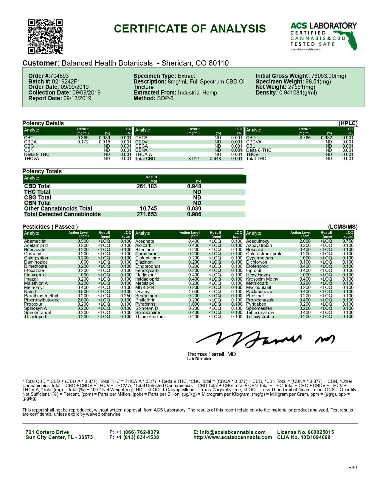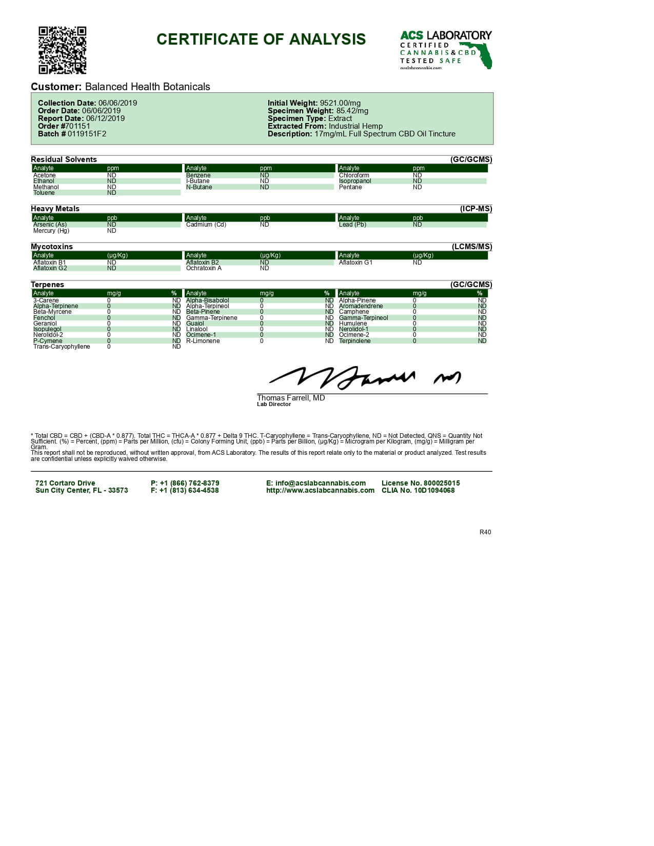 CBDistillery CBD Tincture Full Spectrum 250mg Lab Report