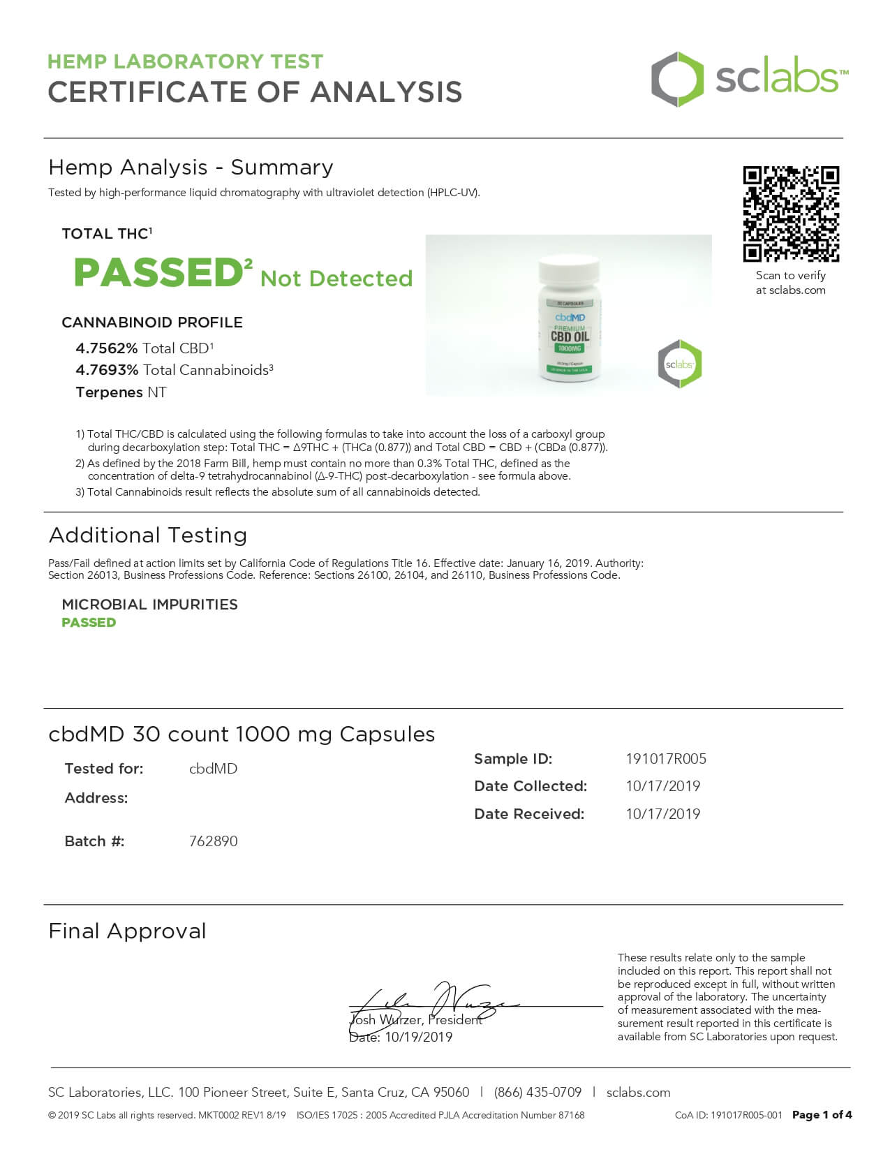 cbdMD CBD Capsules Broad Spectrum Capsules 30ct 1000mgLab Report