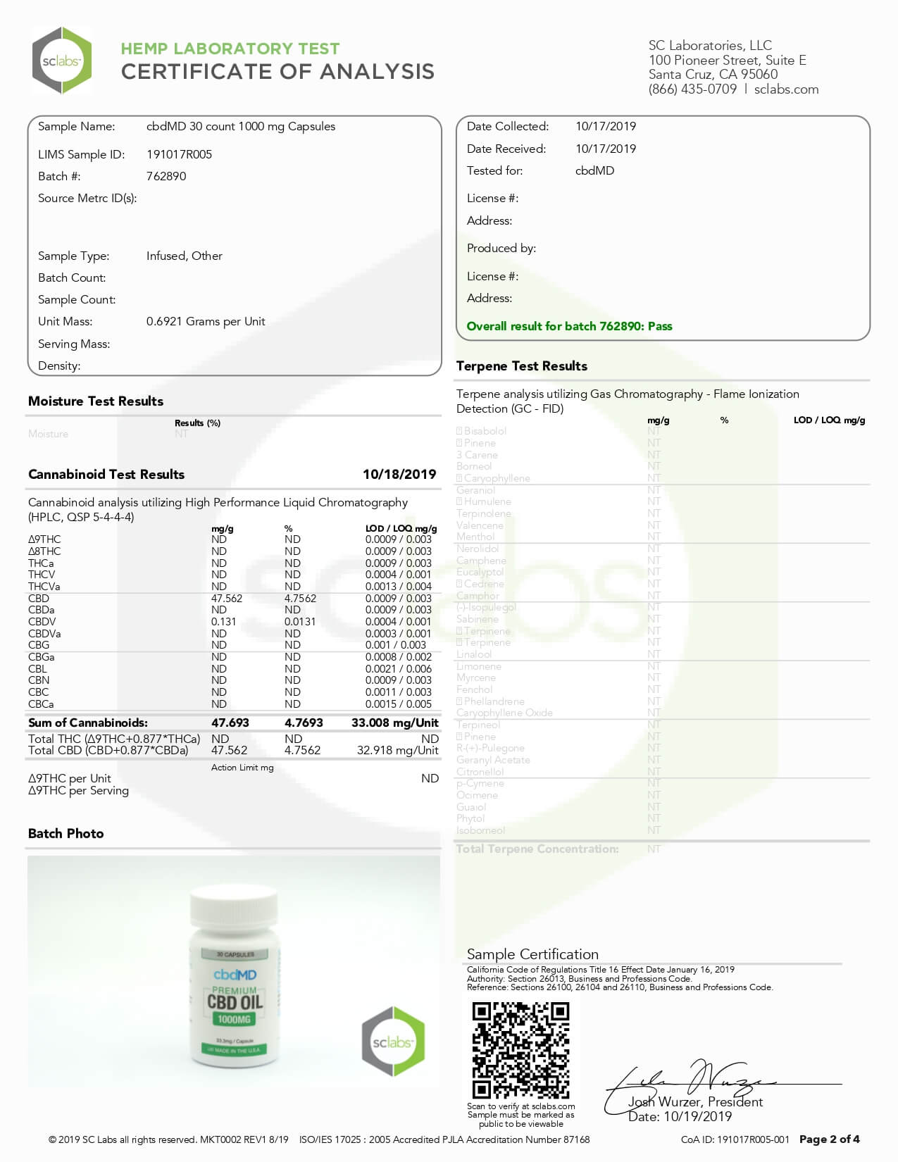 cbdMD CBD Capsules Broad Spectrum Capsules Lab Report