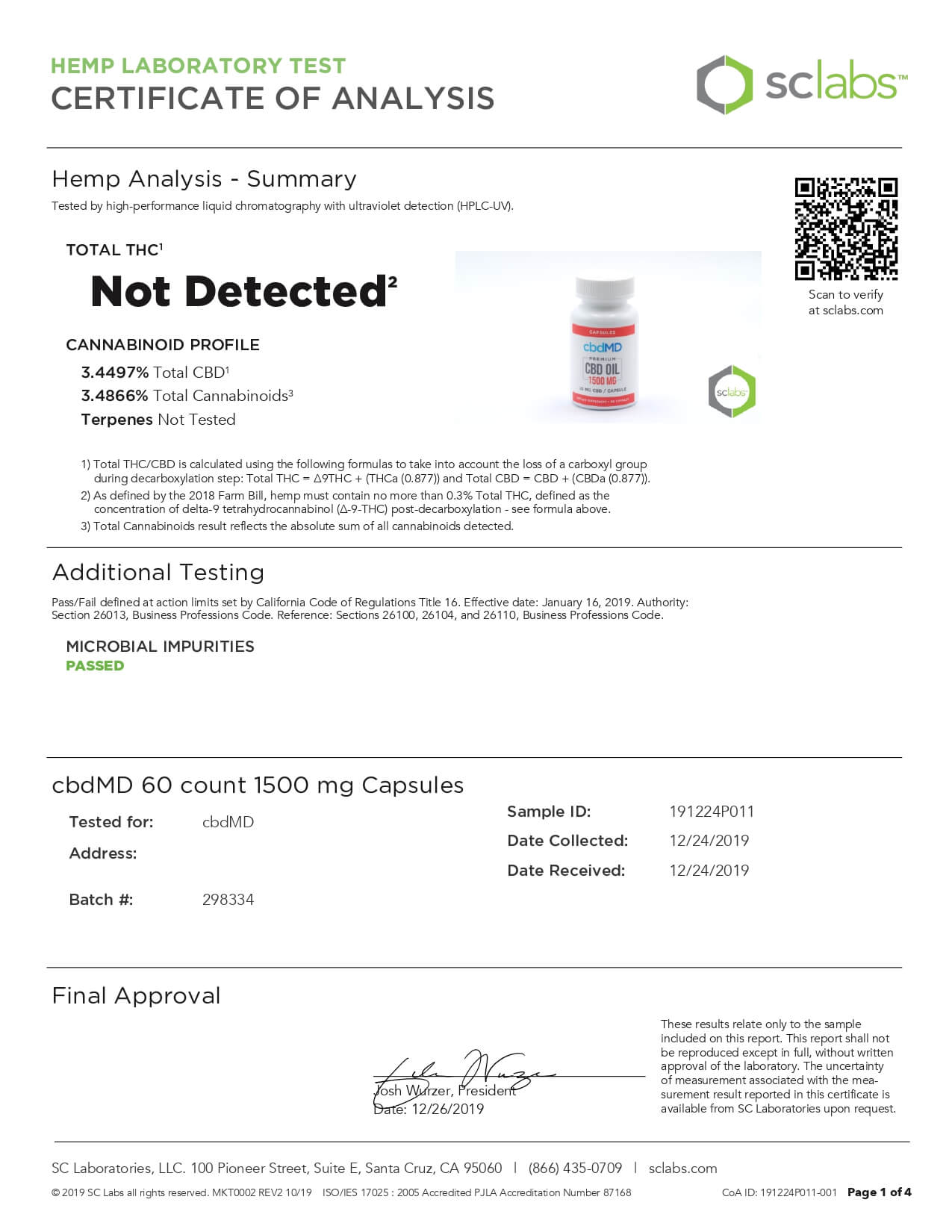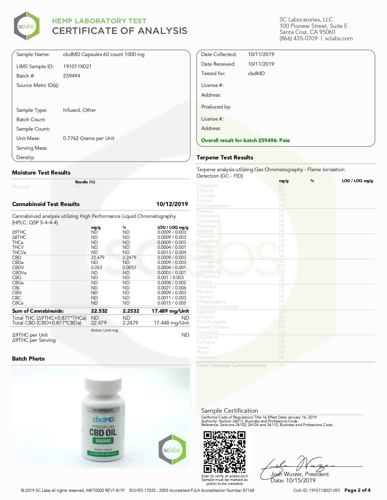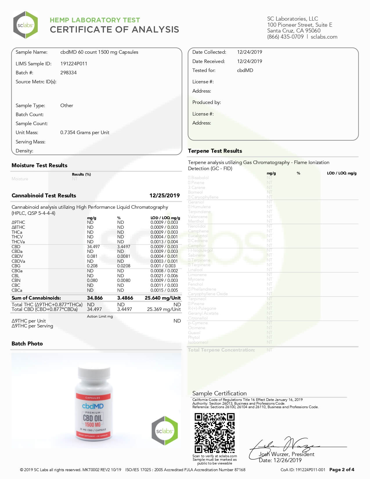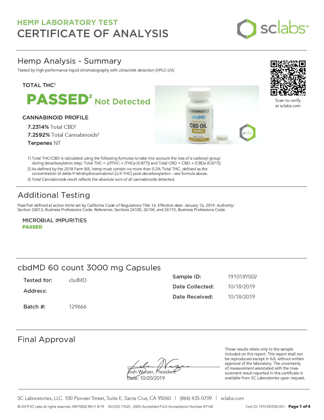 cbdMD CBD Capsules Broad Spectrum Capsules 60ct 3000mgLab Report