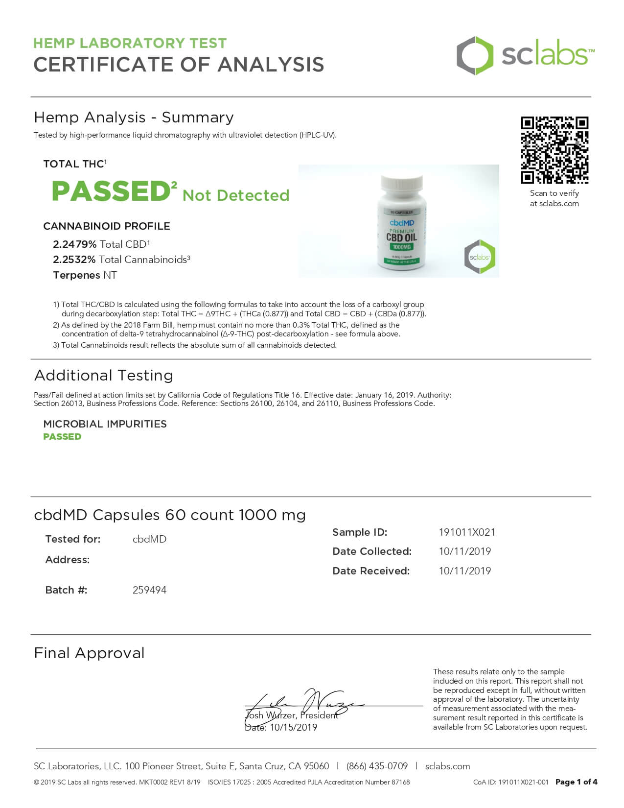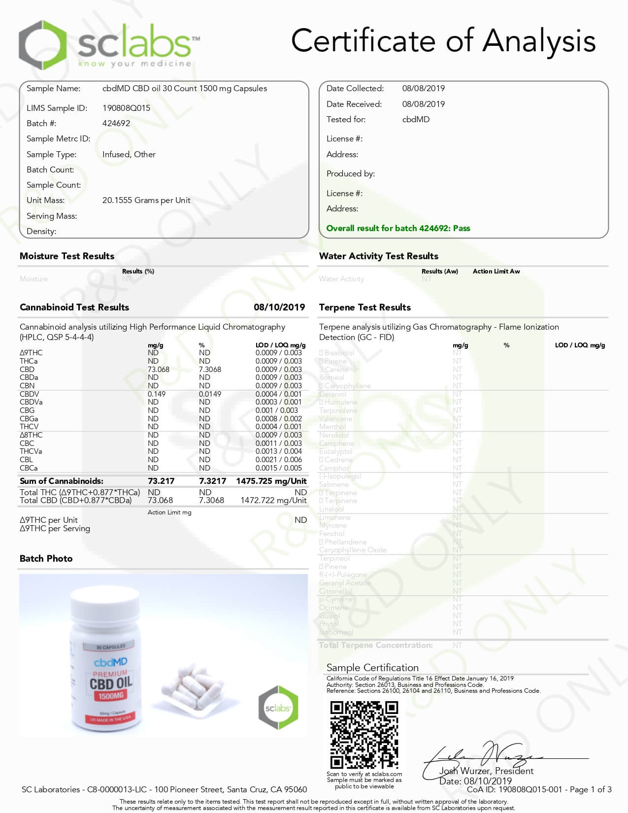 cbdMD CBD Capsules Broad Spectrum Capsules 60ct 1500mgLab Report