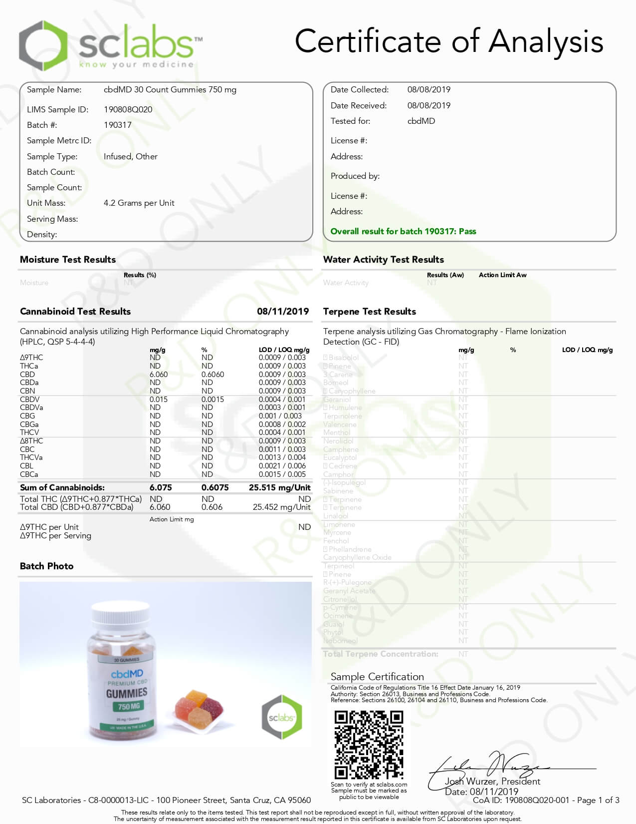 cbdMD CBD Edible Broad Spectrum Gummies 750mg Lab Report